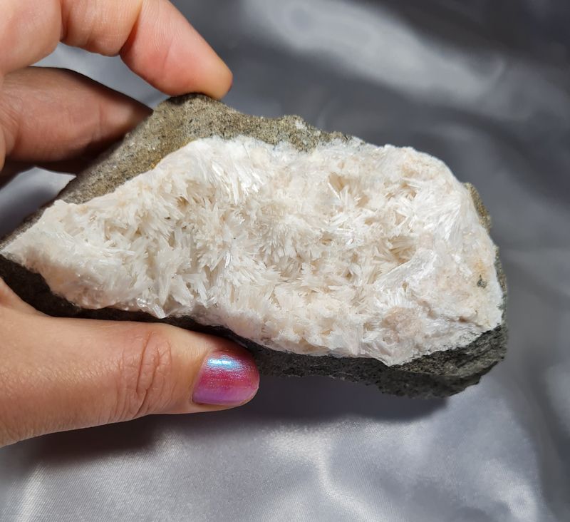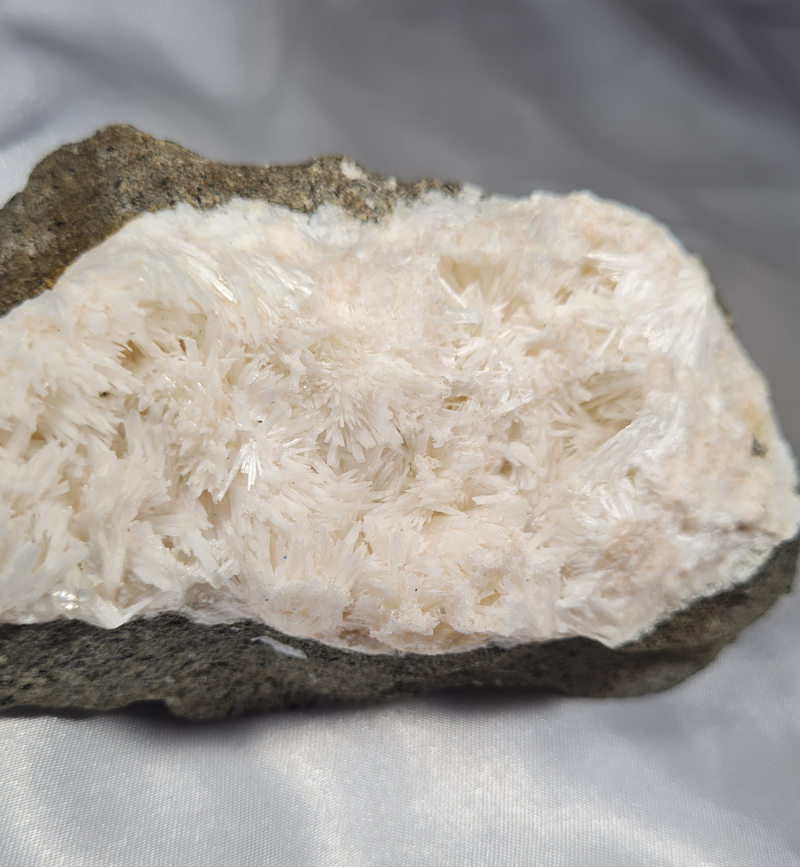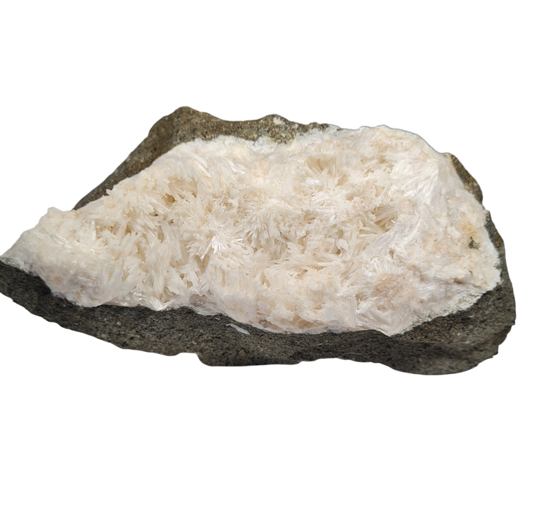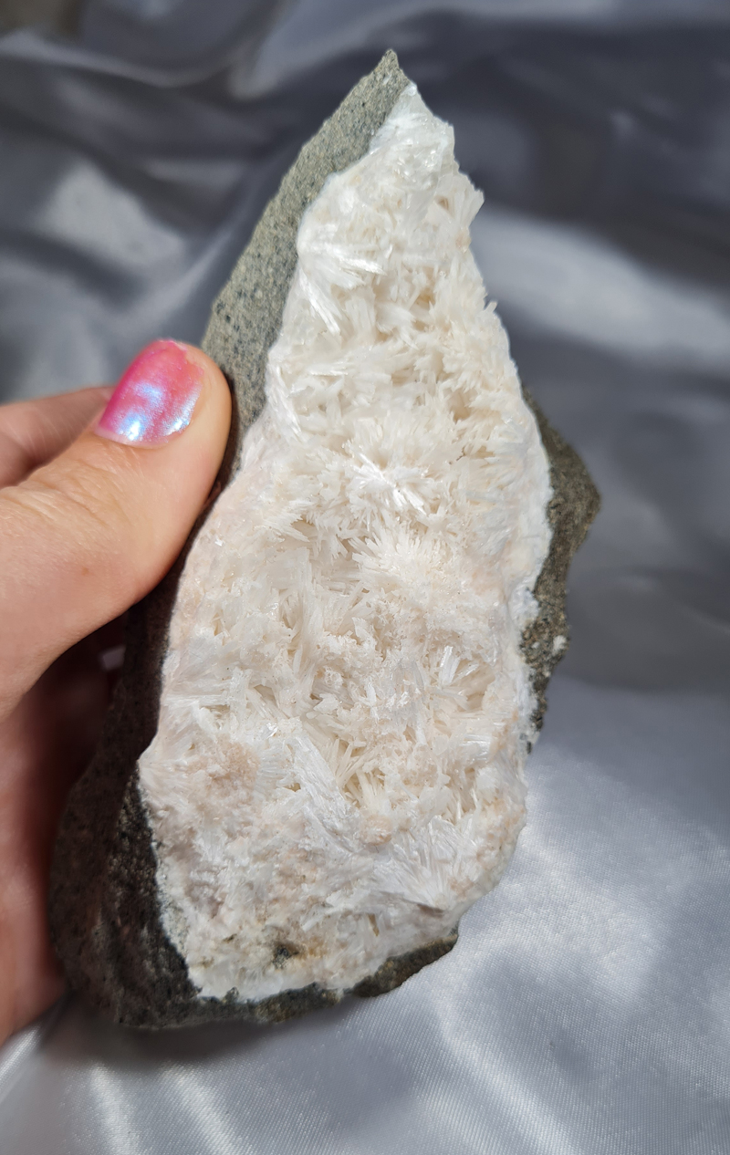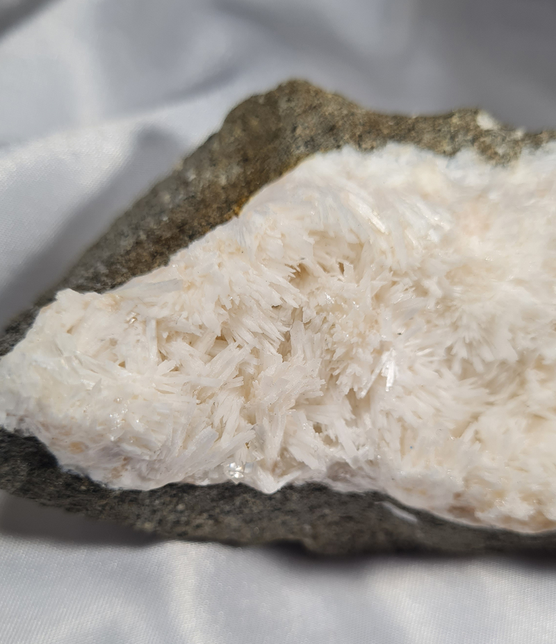 Je ontvangt precies het exemplaar zoals op de foto te zien is: een verfijnde combinatie van witte Thomsoniet- en Natrolietkristallen op een donkere matrix, subtiel aangevuld met zacht glanzende Calcietinsluitingen. Dit contrast maakt het stuk zowel decoratief indrukwekkend als energetisch krachtig.