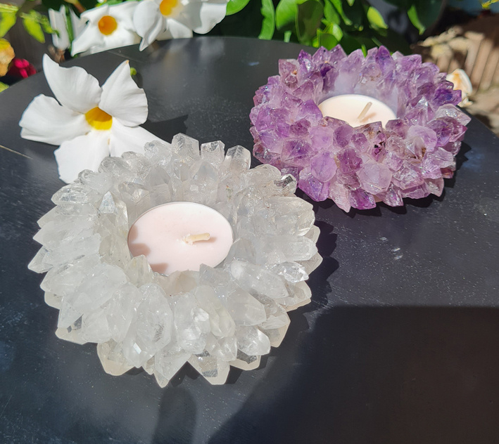 Deze theelichten zijn gemaakt door kleine bergkristal punten aan elkaar te lijmen.