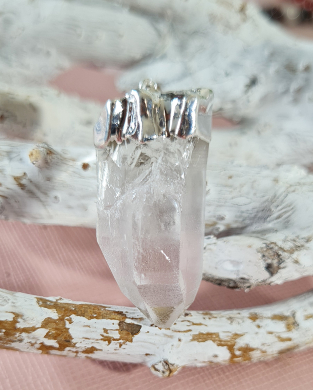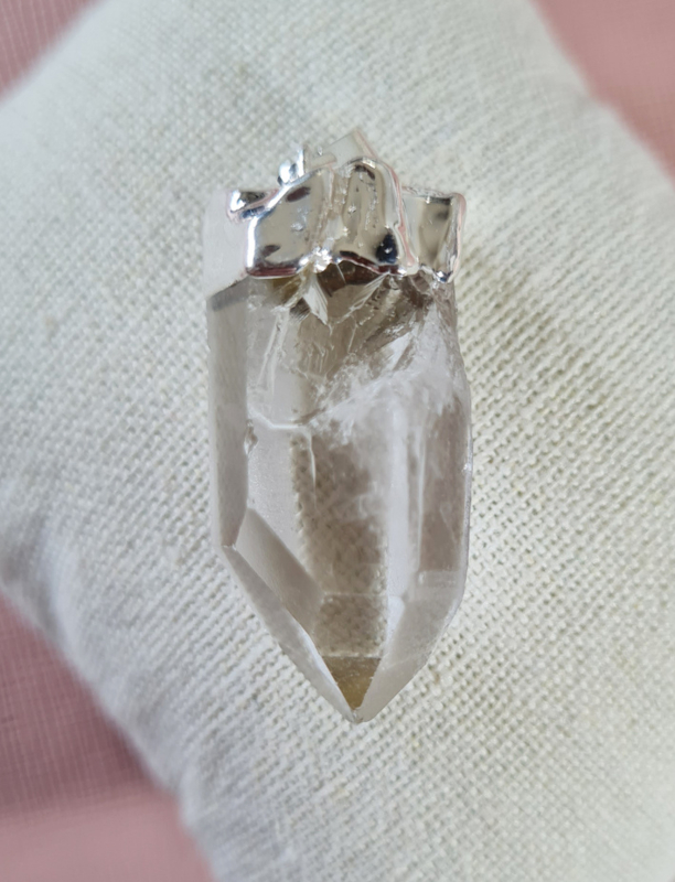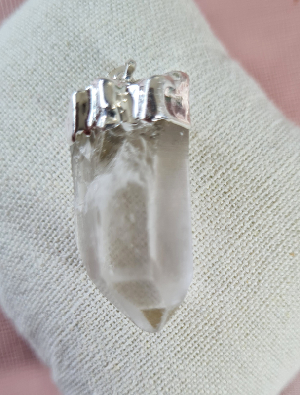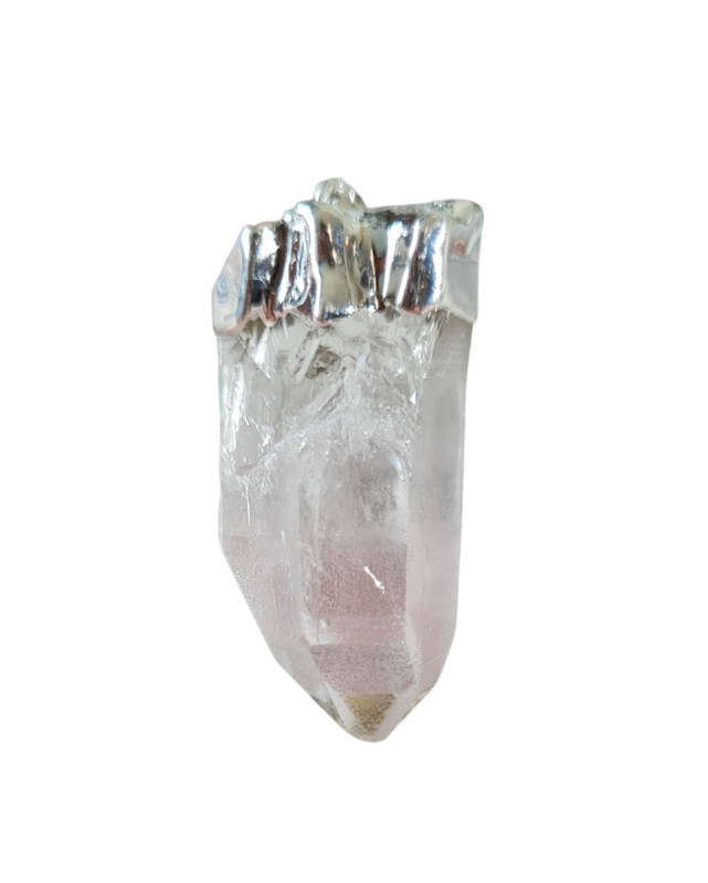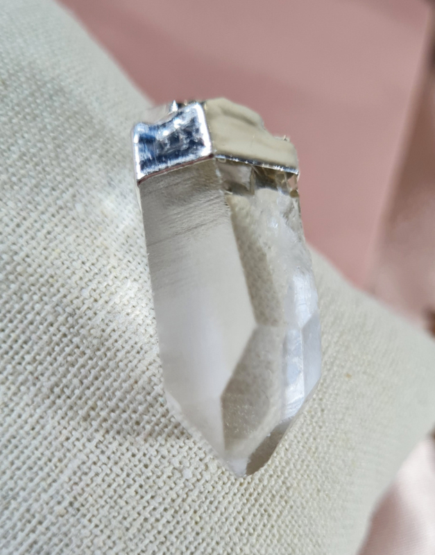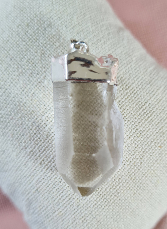Een mooie Bergkristal punt als hanger met een verzilverde top, hiermee is ook het oogje bevestigd.