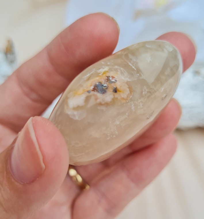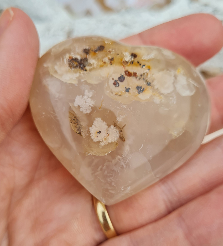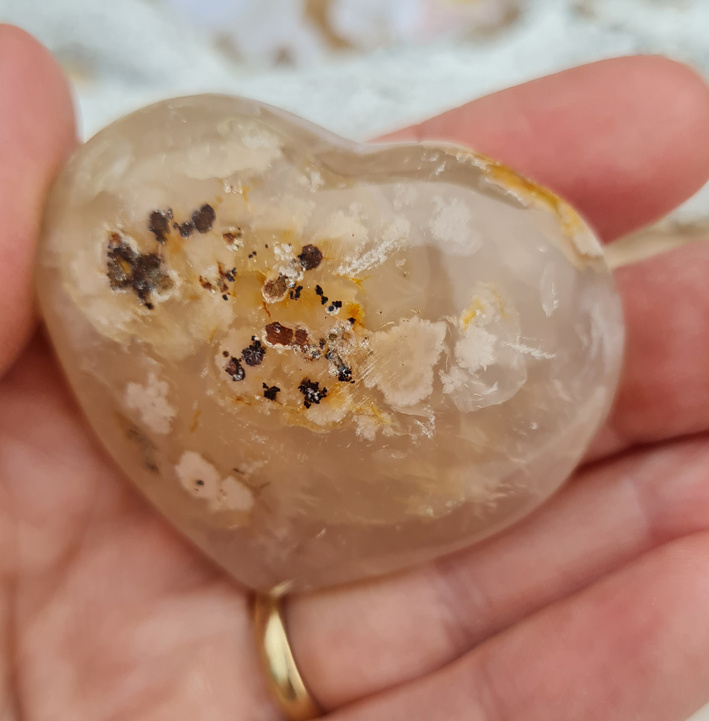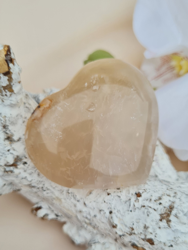 Dit mooie hart is vrij rustig van uiterlijk. Met zijn zachte energie licht hij fijn in de hand. Heeft enkele natuurlijke inkepingen met wat ijzerafzetting op deze gebieden.