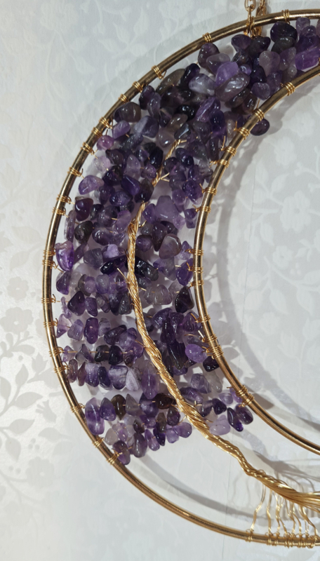 De grote maan heeft in zich de levensboom met hierop allemaal kleine Amethist steentjes. Aan de bovenste punt van de maan hangt een kettinkje met hieraan een kristalbol. Deze zorgt voor de mooiste regenbogen in jouw huis, op alle muren, zodra hier het zonlicht op valt.