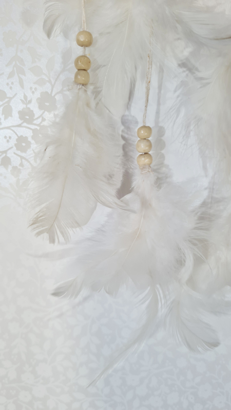 Deze dromenvanger is van hennep gemaakt. met mooie houten kralen en witte veertjes.