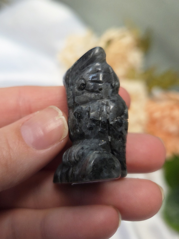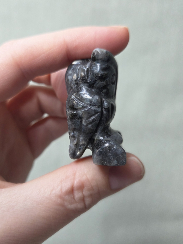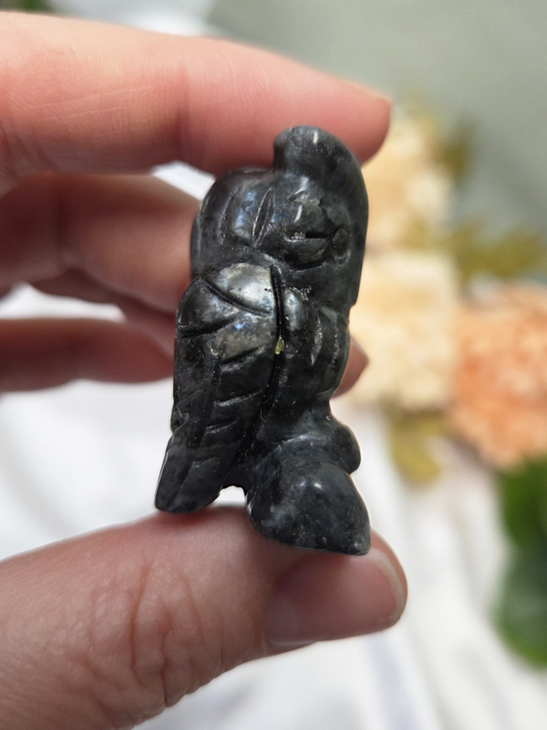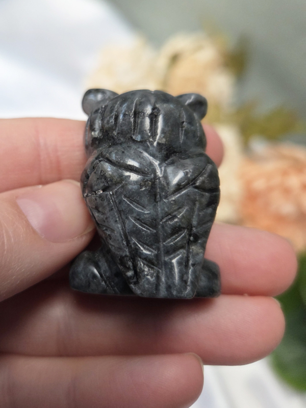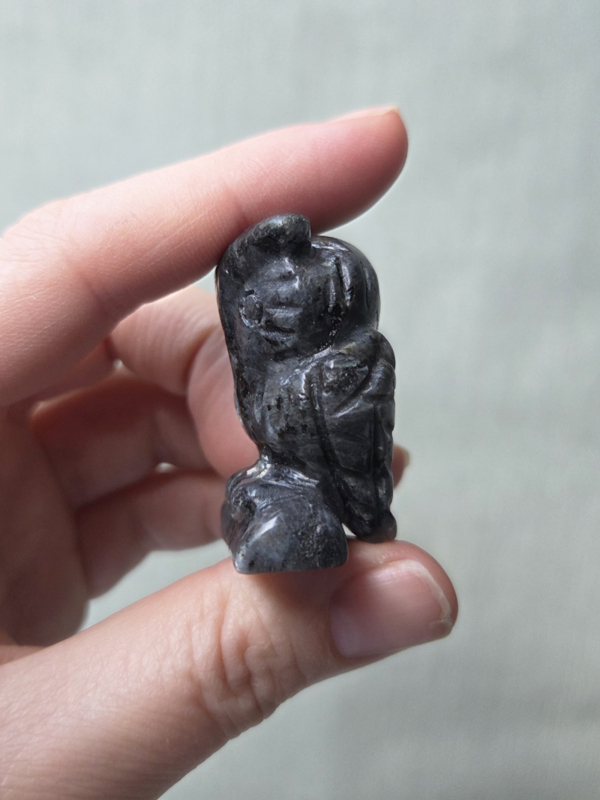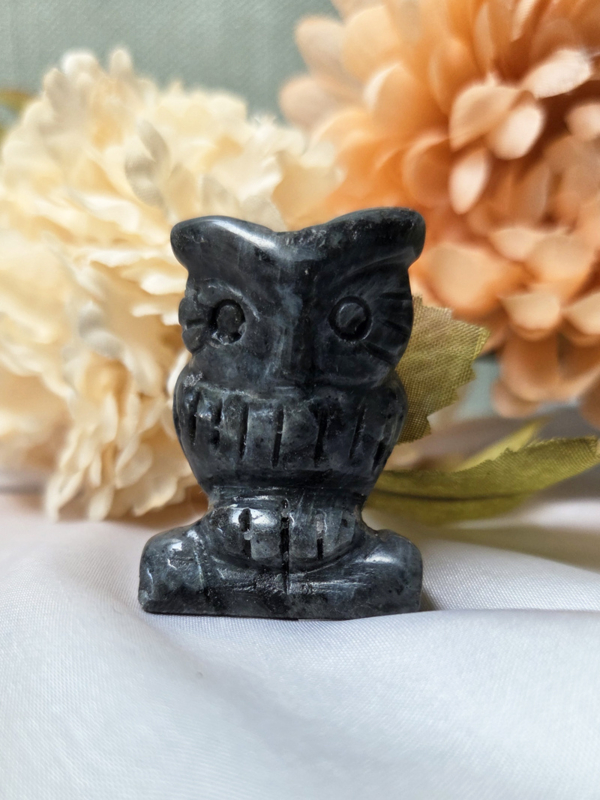 Larvikiet ondersteunt je intuïtie, inzicht en heeft een beschermende energie. De uil die versterkt het thema van wijsheid en alertheid.