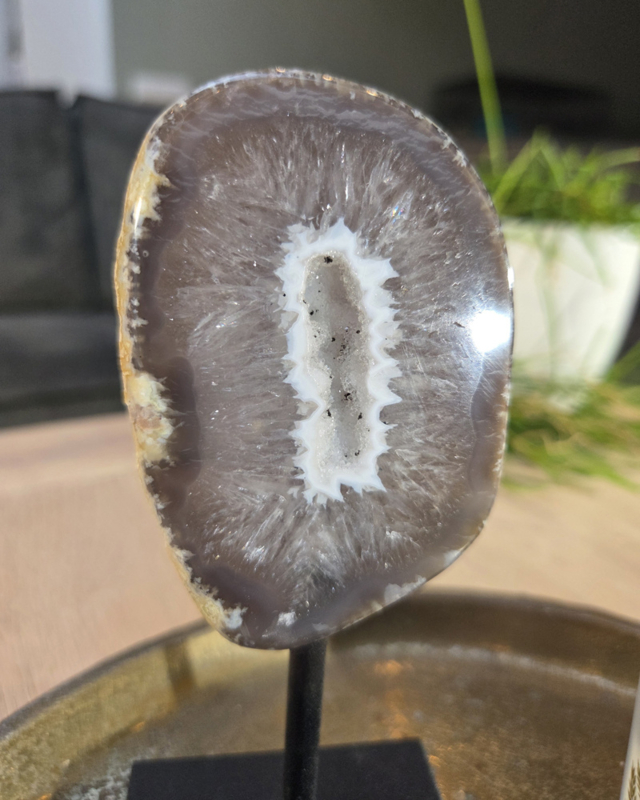 Deze Agaat heeft een ovale vorm. Met een zacht bruine buitenste laag gevolgd door een mooie brede kwartsrand. In het midden zit een witte rand met een opening binnenin. Hierin zitten mooie druzy kristallen.