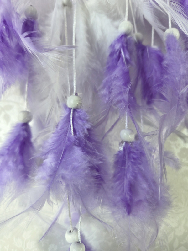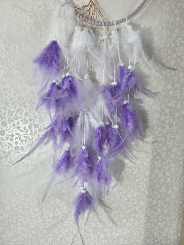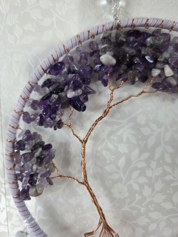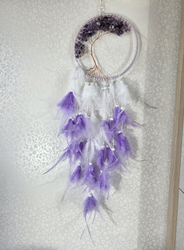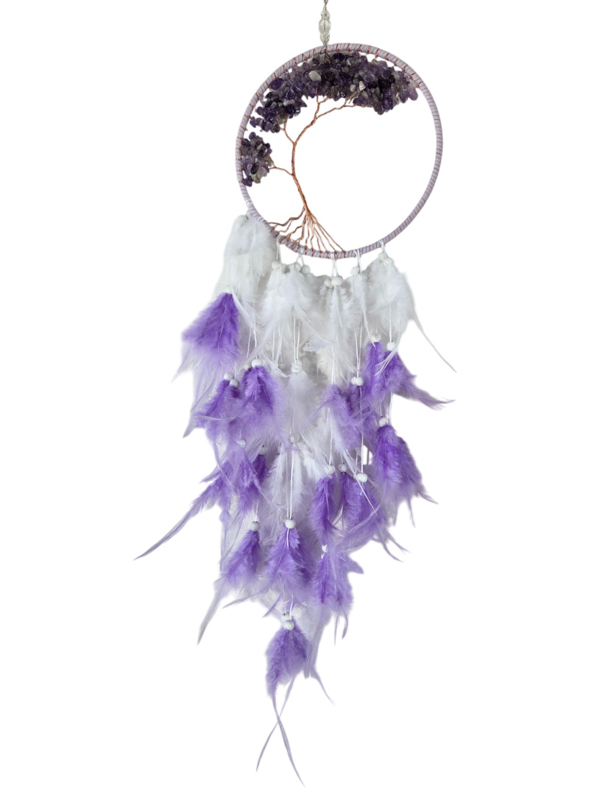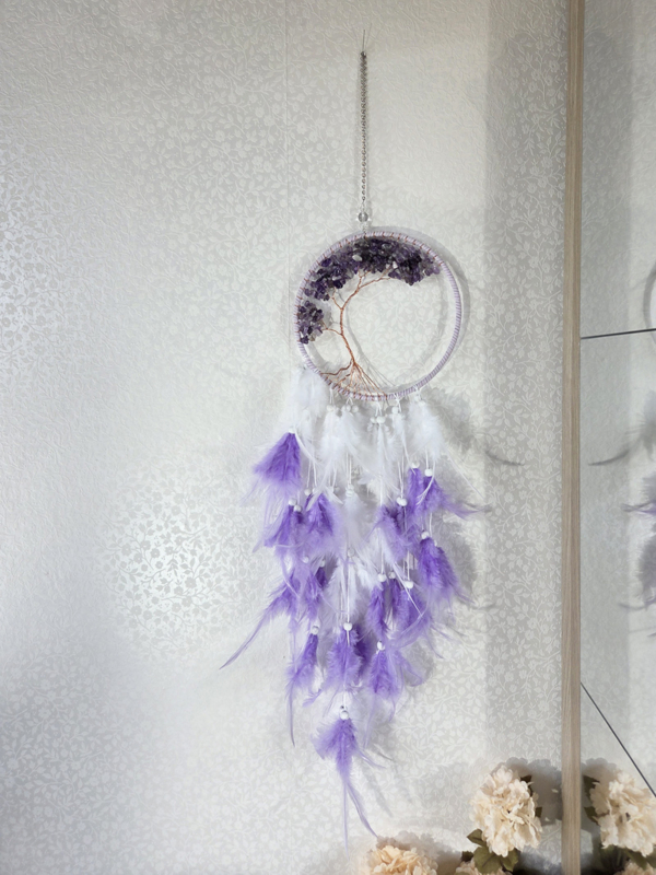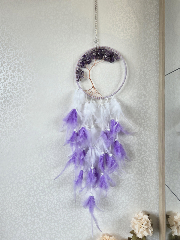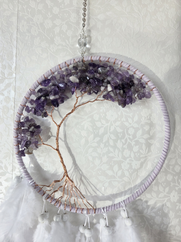Artikelnummer: P4154 OverzichtEen supergave Dromenvanger in het paars en wit met als dromenvanger de levensboom versierd met amethist als bladeren.