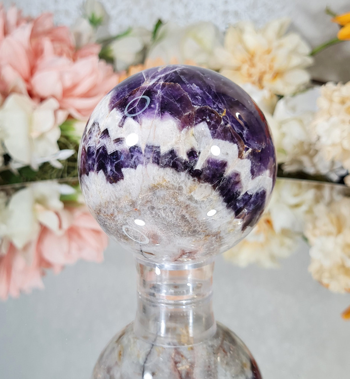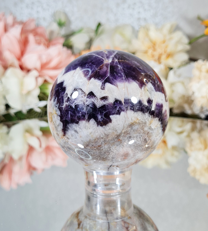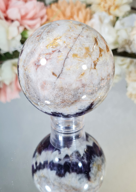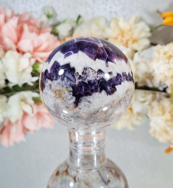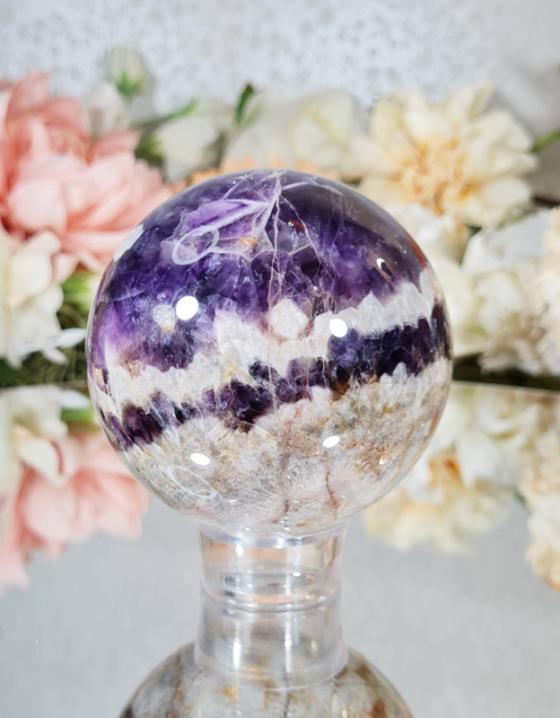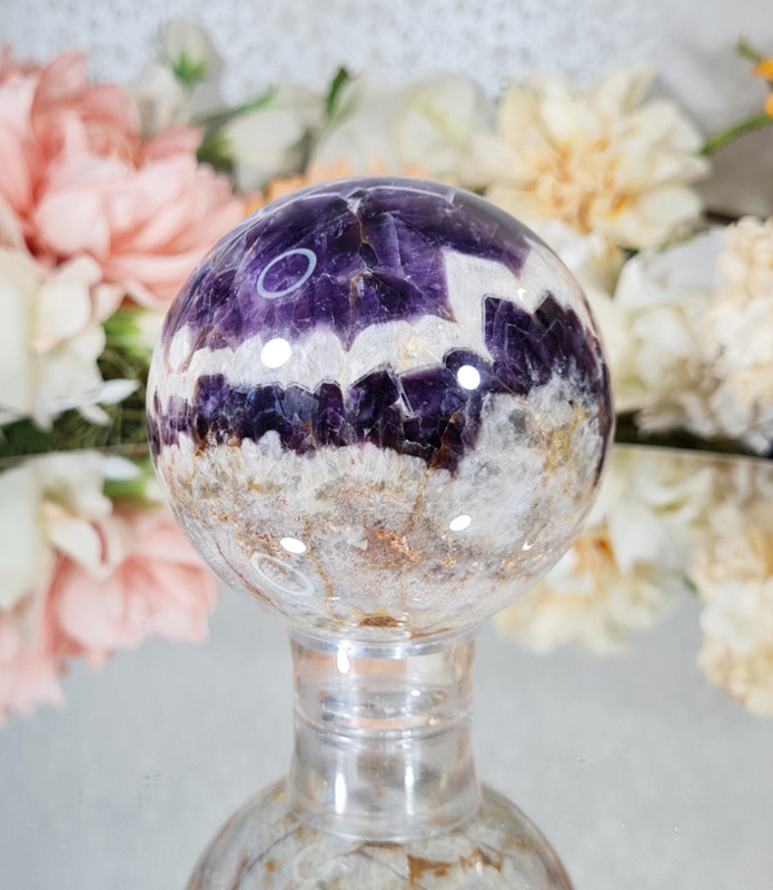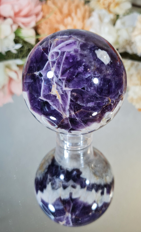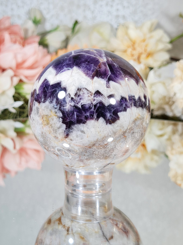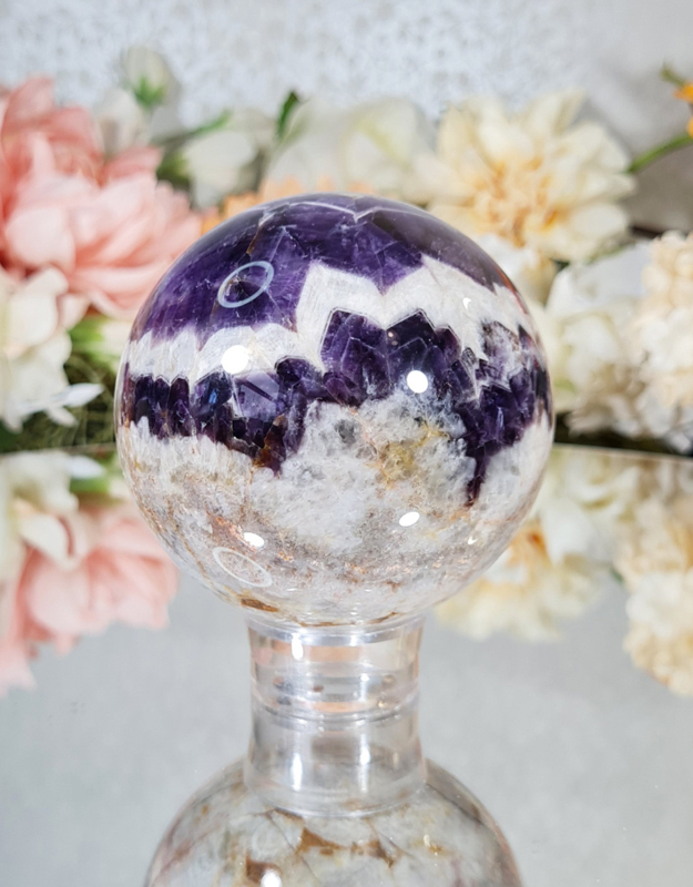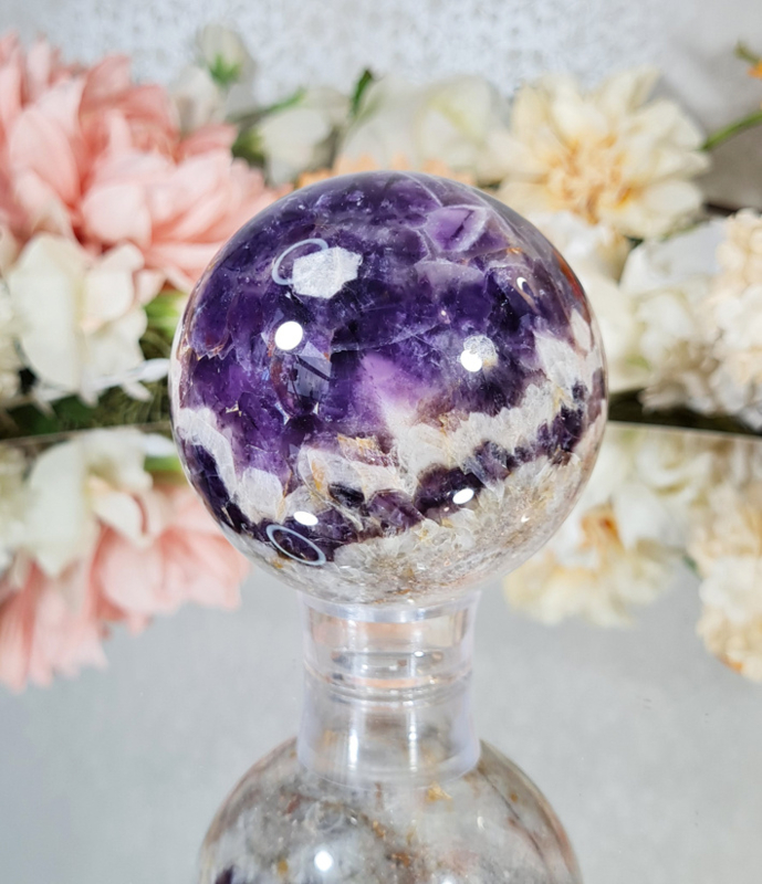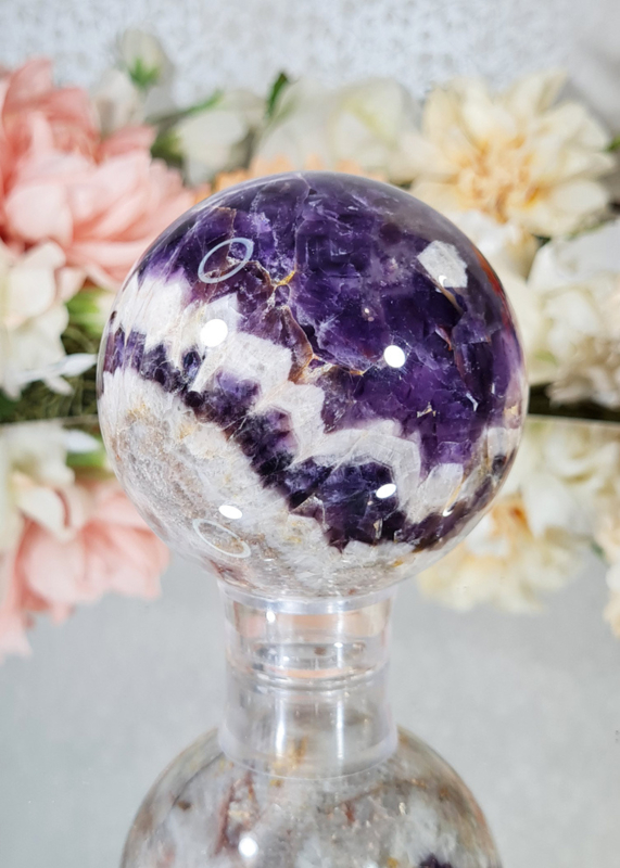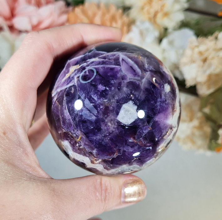 Een geweldige grote bol van maar liefst 7 cm. Deze bol heeft mooie kwarts lijnen in zich en prachtig diep paars.