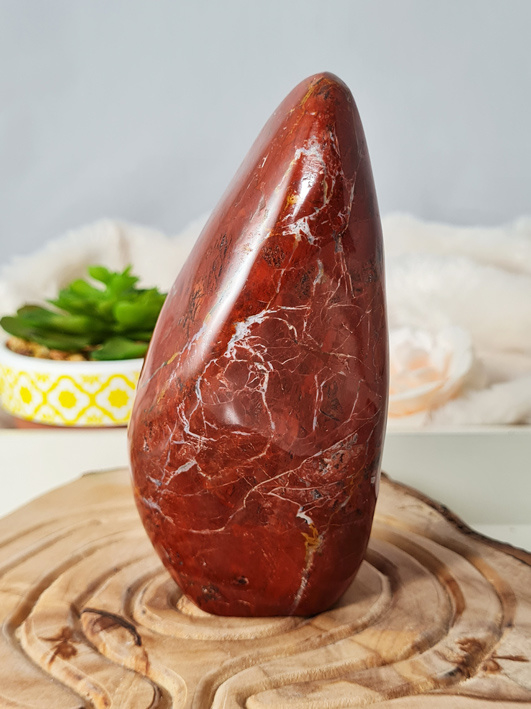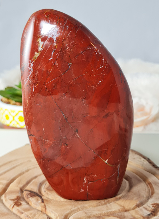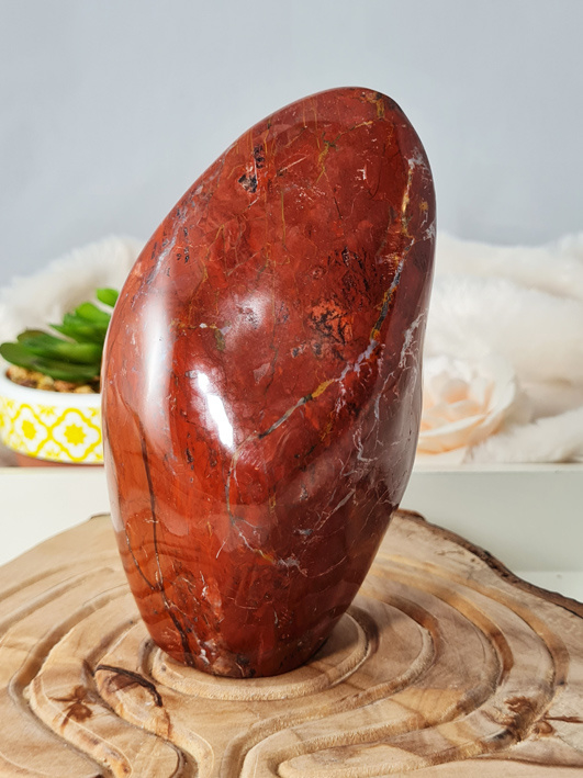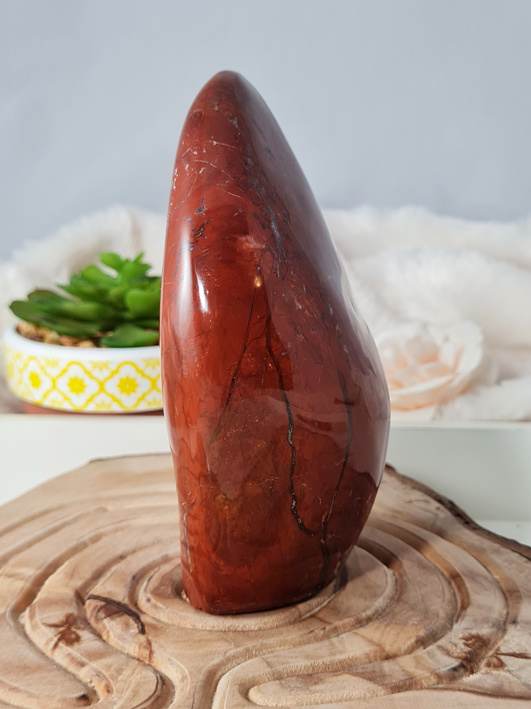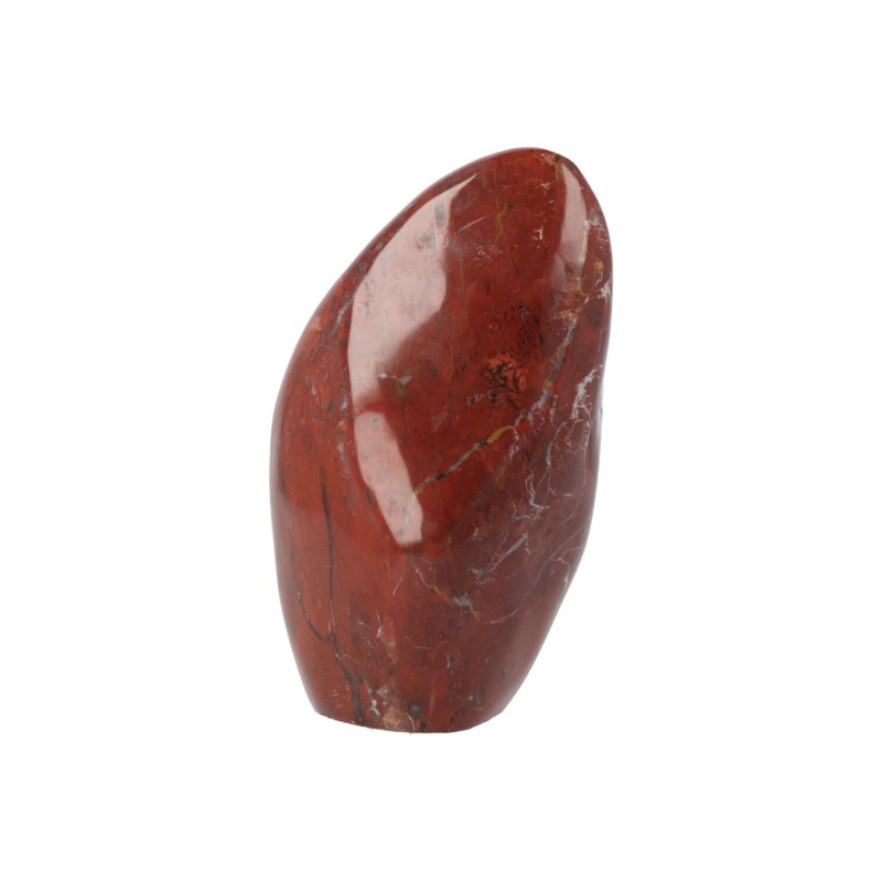 Mooie gepolijste Rode Jaspis sculptuur in vrije vorm. Een bijzonder mooi sculptuur met enkele lichte en donkere lijnen in zich. Mooi glad gepolijst.