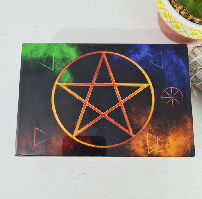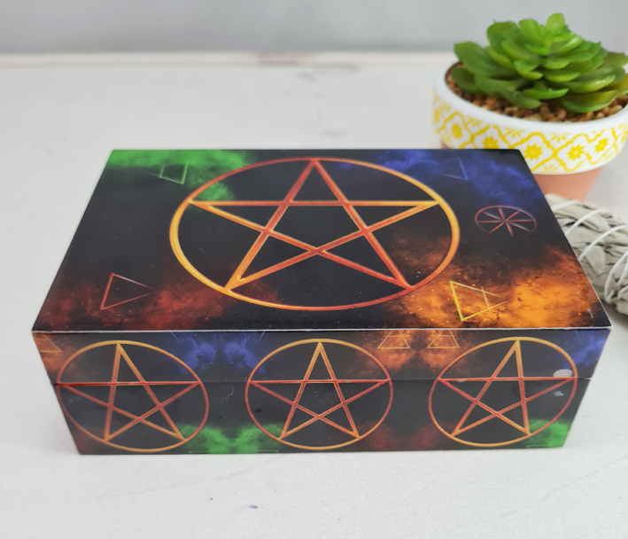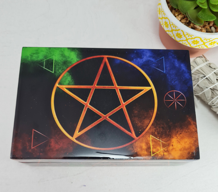 OverzichtEen prachtige doos voor onder andere je tarotkaarten, spirituele artikelen en andere mooie dingen die je hier in wilt bewaren. Een prachtig kleurrijke doos naast het pentagram symbool ook nog andere kleinere symbolen.