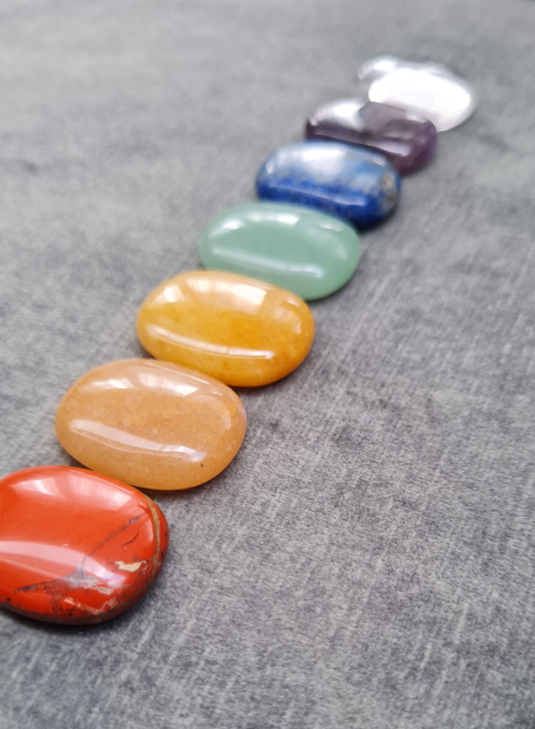 Artikelnummer: P14142 - p Overzicht7 chakra zorgstenen in zakformaat, 1 van elke soort: amethist, bergkristal, groene aventurijn, lapis lazuli, topaas jaspis, carneool, rode jaspis.