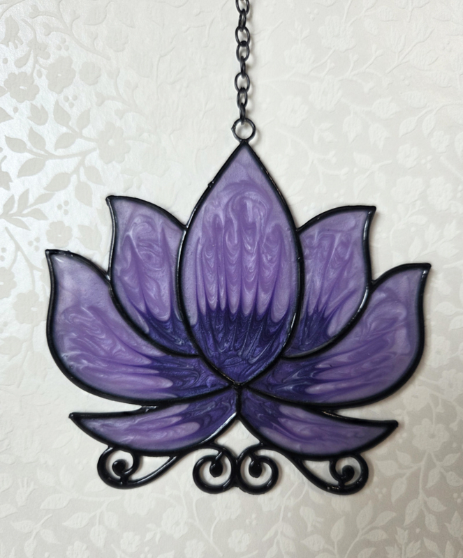Deze raamhanger in de vorm van een lotusbloem is echt zo’n item dat meteen sfeer brengt zodra het zonlicht erop valt. Gemaakt van prachtig paars glas en subtiel omlijst met zwart metaal krijgt hij een stijlvolle en moderne uitstraling die in bijna elk interieur tot zijn recht komt.