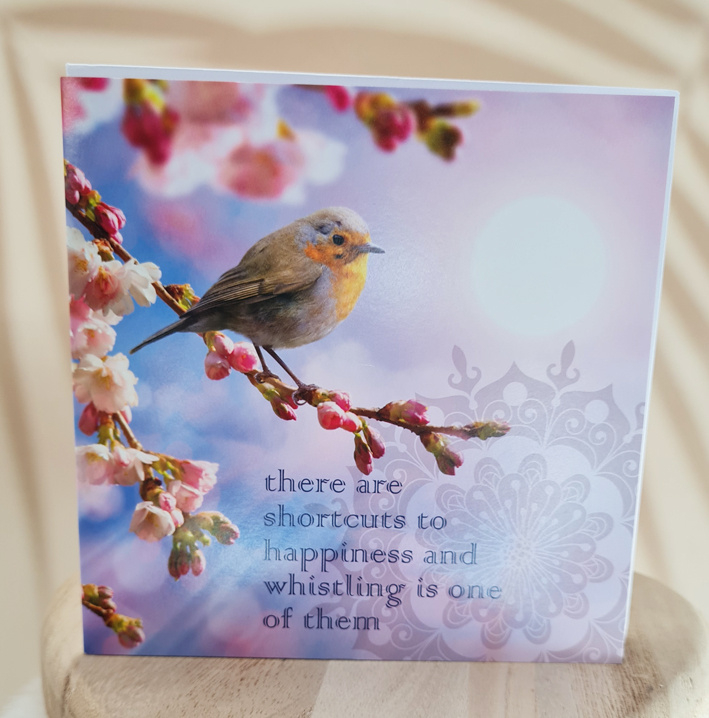 Mooie vrolijke kaart met een roodborstje zittend in het zonnetje op een tak met roze bloesems.
