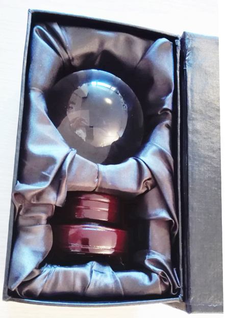 Artikelnummer: D6070007 - P16567 Overzichtmooi heldere glas-kristallen bol met een roodbruine houten standaard