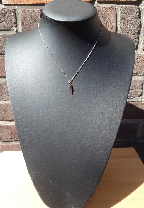 Artikelnummer: TBE2-051 OverzichtZeer chique ketting met de hanger van een opgewerkte veer. De ketting bestaat uit fijne schakeltjes en is rosé van kleur. Hij is gemaakt van Stainless Steel - RVS