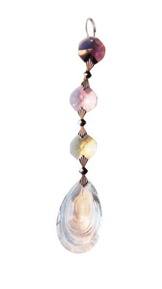 Met drie achthoekige glazen kralen in de kleuren paars, roze en geel. De hanger is wit. Hij is uit verschillende lagen opgebouwd. Tussen de kralen zitten sierlijke metalen verdelers.