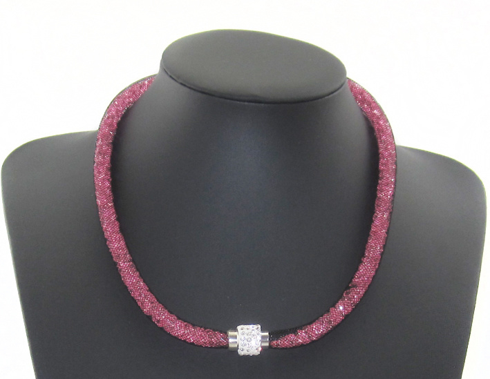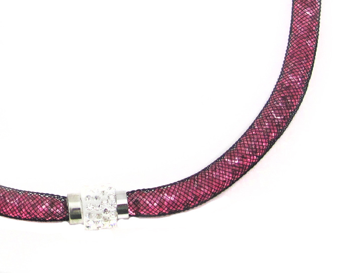 Wat een originele mooie trendy ketting is dit. De ketting is ca. 1 cm breed en bestaat uit een zwart kunststof gaas, hierin zitten allemaal kleine roze strass steentjes. Hij heeft een mooie stevige magneet sluiting. Het midden van de sluiting is wit met hierop mooie heldere strass steentjes. De ketting is dus met de sluiting naar voren of in de nek te dragen.