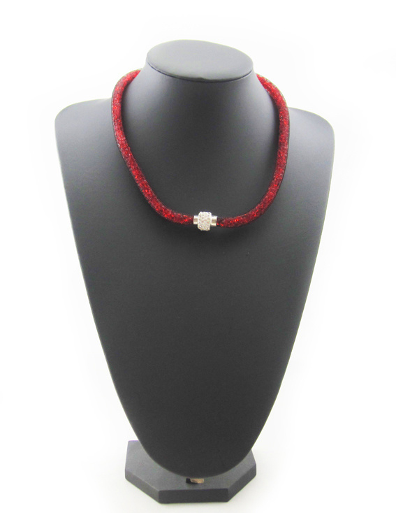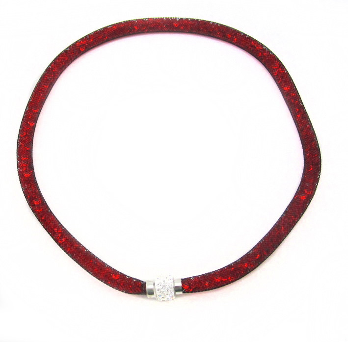 Wat een originele mooie trendy ketting is dit. De ketting is ca. 1 cm breed en bestaat uit een zwart kunststof gaas, hierin zitten allemaal kleine rode strass steentjes. Hij heeft een mooie stevige magneet sluiting. Het midden van de sluiting is wit met hierop mooie heldere strass steentjes. De ketting is dus met de sluiting naar voren of in de nek te dragen.