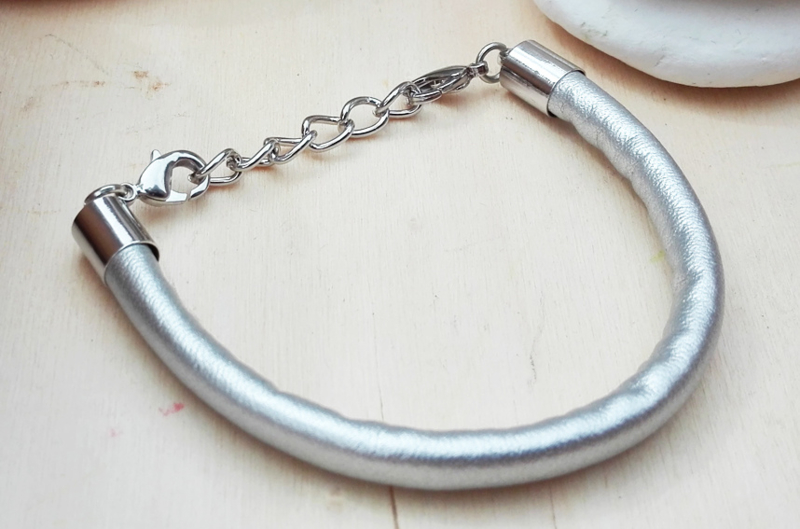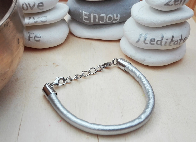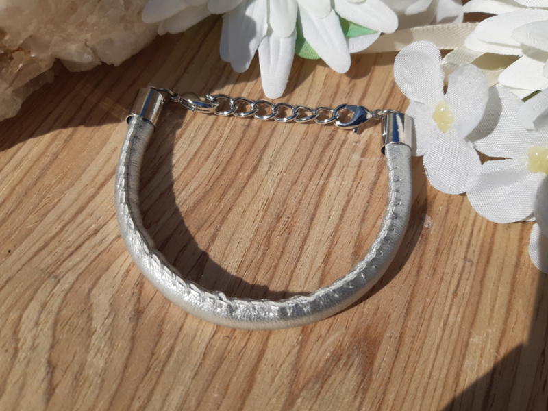 Een mooie kunstlederen armband in glanzend zilver. Aan beide zijden zitten karabijn sluitingen om deze te kunnen stellen tot de juiste lengte met het kettinkje.
