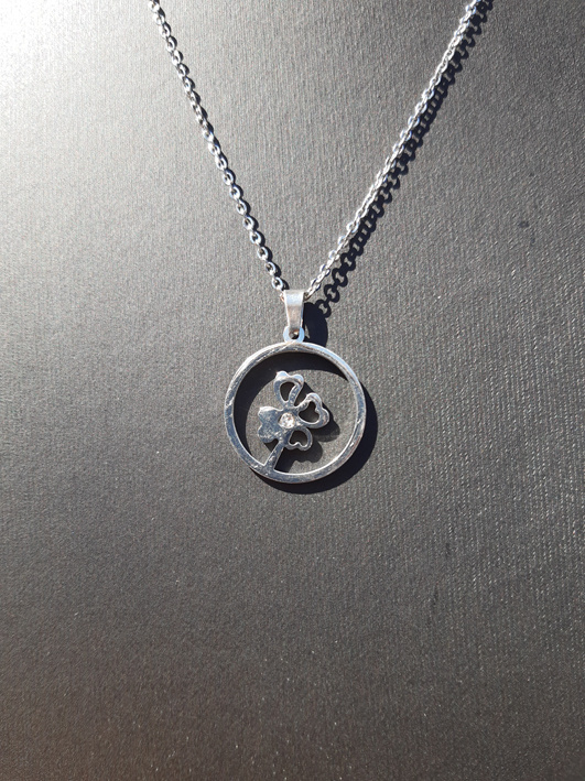 Artikelnummer: TBO6-002 OverzichtDe ketting bestaat uit cirkel met hierin een klavertje vier met een klein strass steentje in het klavertje. De oorbellen hebben hetzelfde motief.