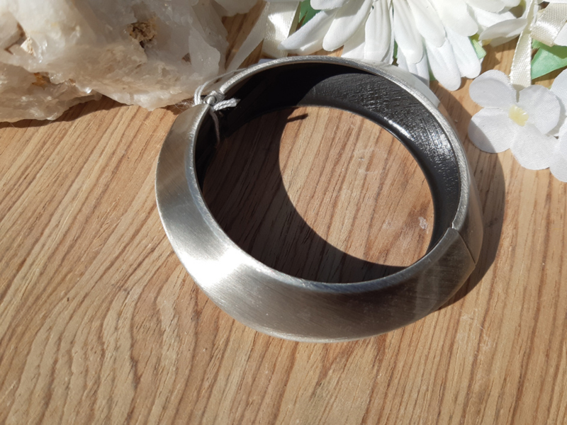 Een chique armband met een doorsnede van 6 cm. Gemaakt van metaal in zilverkleur. Met een scharnieropening.