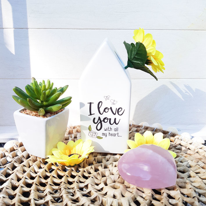 OverzichtEen lief en leuk vaasje in de vorm van een huis.