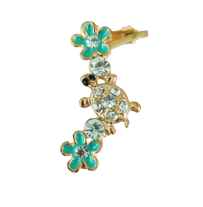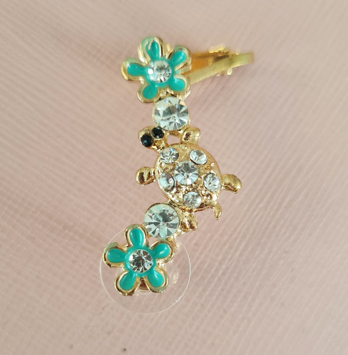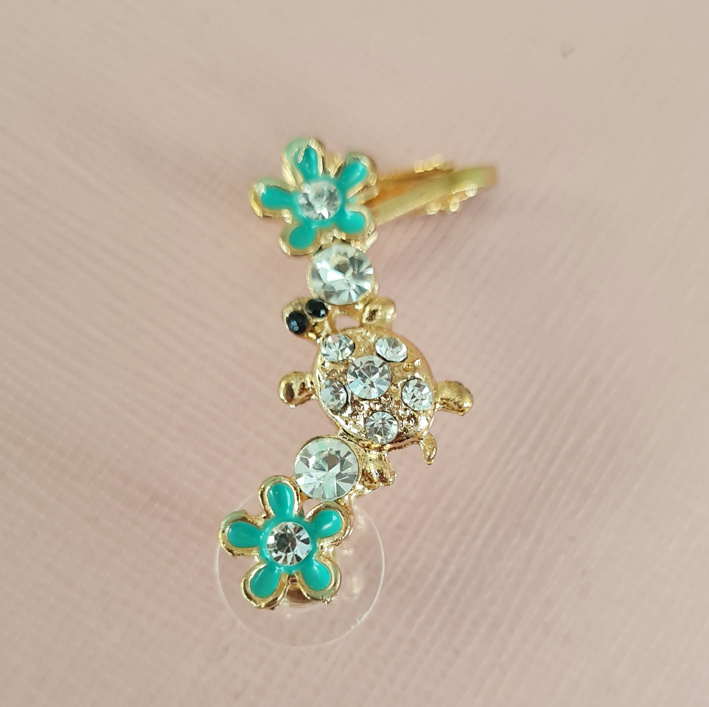 Op deze earcuff zijn twee blauwe bloemen te zien, met hieron twee strass steentjes. Ernaast een strass steentje met in het midden een goudkleurige schildpad met strass steentjes op zijn rug en twee zwarte steentjes als zijn ogen.