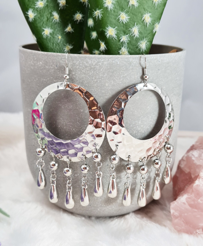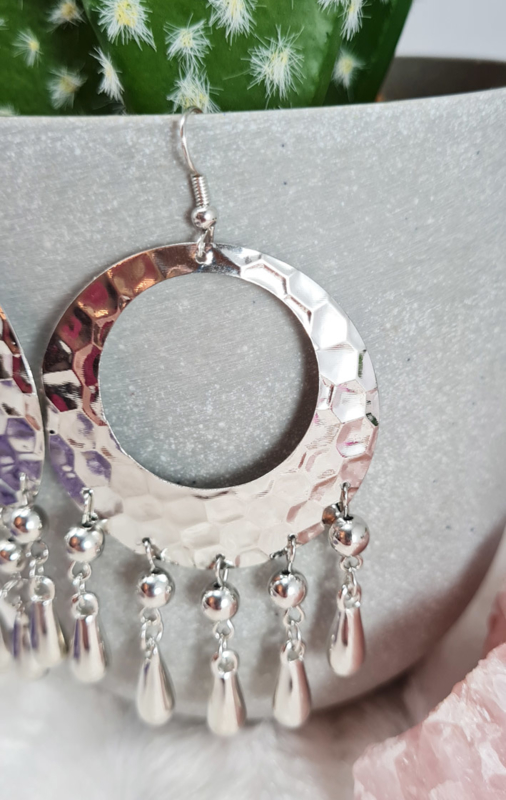 Artikelnummer: CHOB722 p OverzichtMooie oorbellen van gehamerd metaal met hieronder druppels. In zilverkleur.