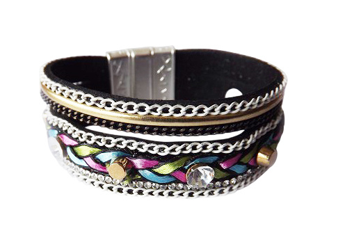 Met verschillende kettinkjes, strass en een mooie vlecht in blauw, groen en roze.