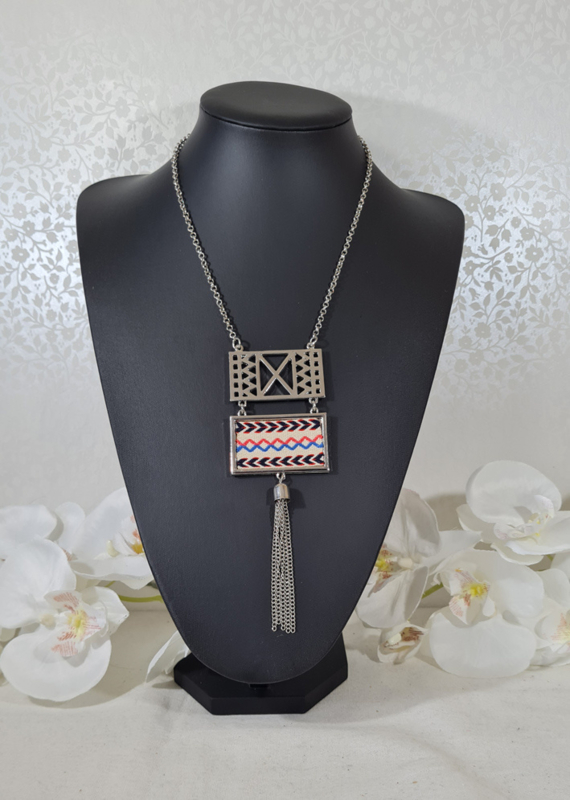 Een mooie ketting met hieraan twee rechthoekige vormen en een kwastje. Deze ketting zal je partylook afmaken.