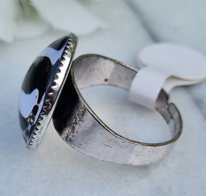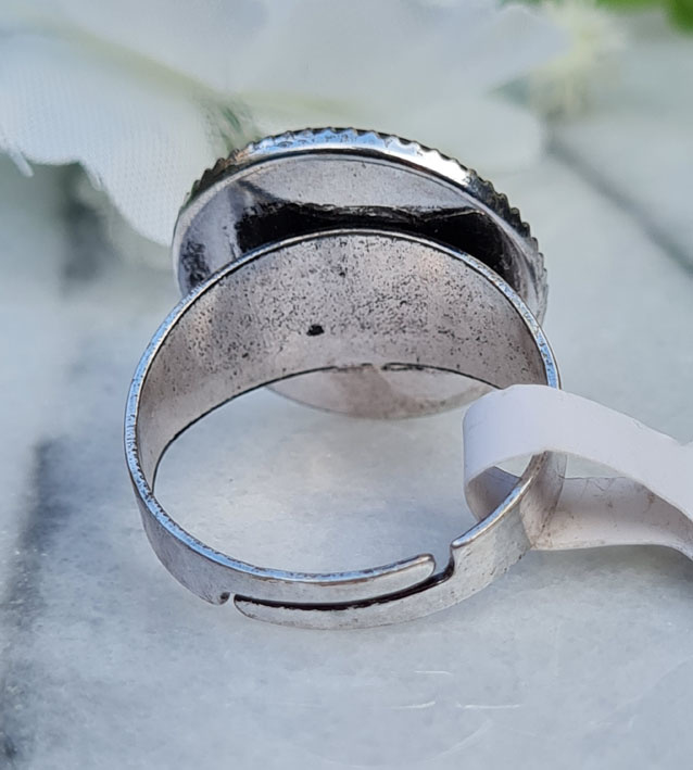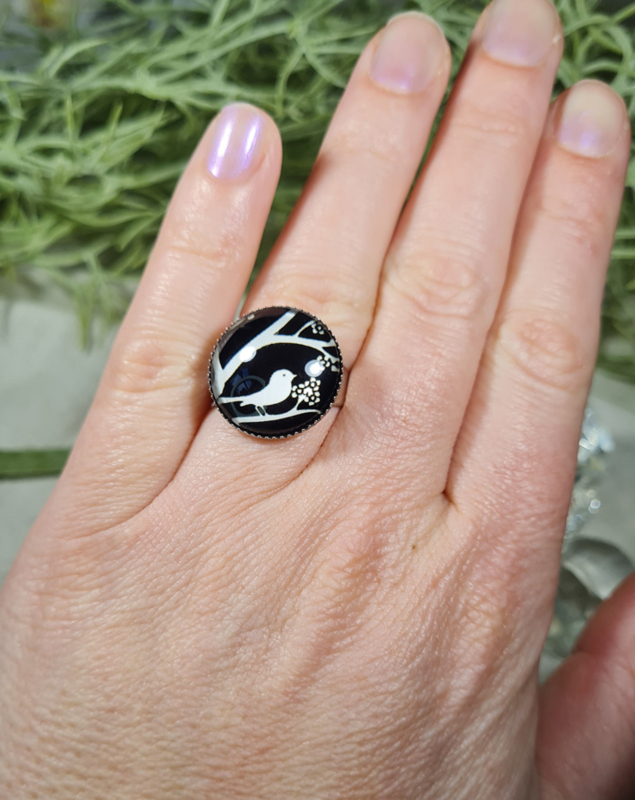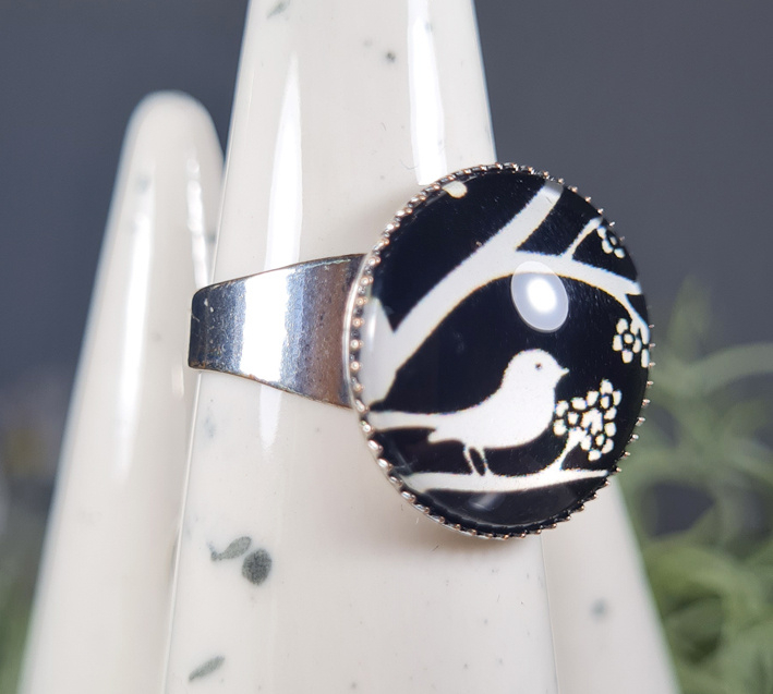 Artikelnummer: CHCS051 - Pf OverzichtMooie verstelbare ring met glas cabochon 18mm met hierop een vogel