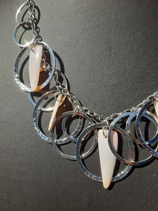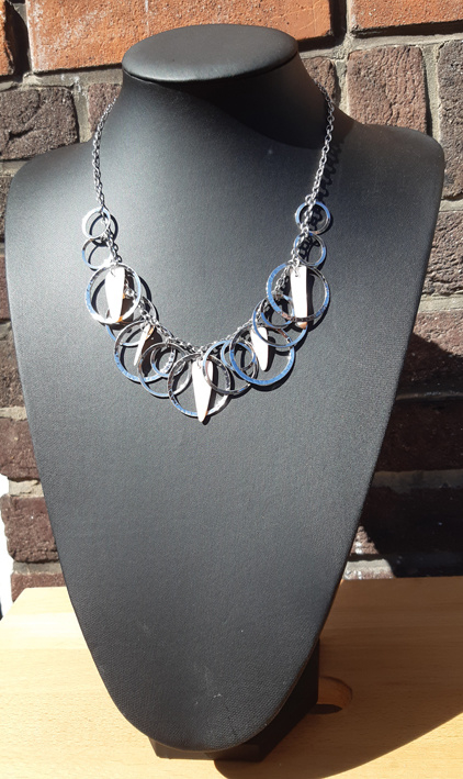 Een leuke ketting met zilverkleurige ringen en hiertussen kunststof schelpjes.