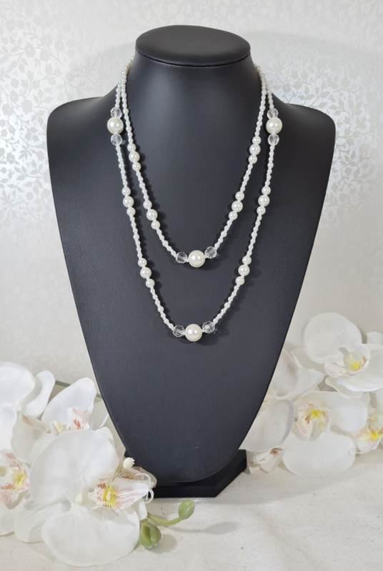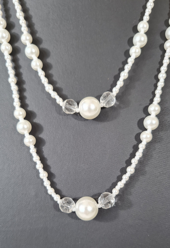 Een leuke ketting met een dubbele laag. Met grotere en kleinere pareltjes en glaskralen.
