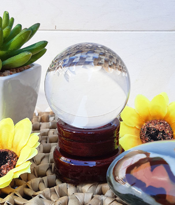 Artikelnummer: D6070006 Overzichtmooi heldere glas-kristallen bol met een roodbruine houten standaard