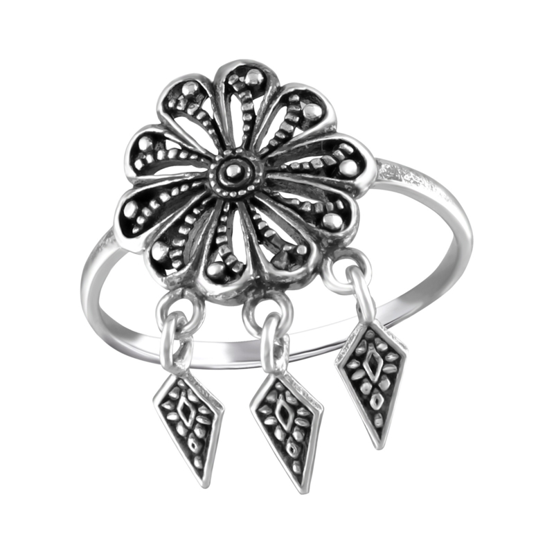 Artikelnummer: PJSD31366 p OverzichtEen prachtige geoxideerde ring in de vorm van een bloem met hieronder drie kleine hangertjes. De ring is gemaakt van 925 Sterling Zilver.