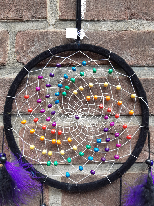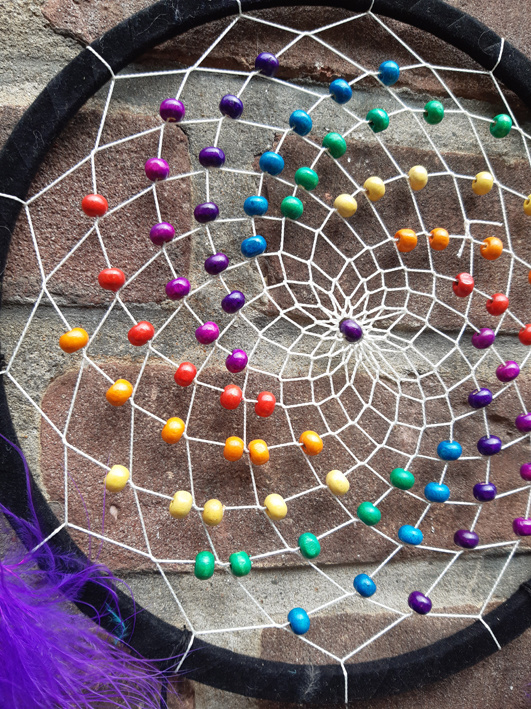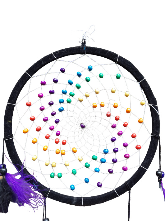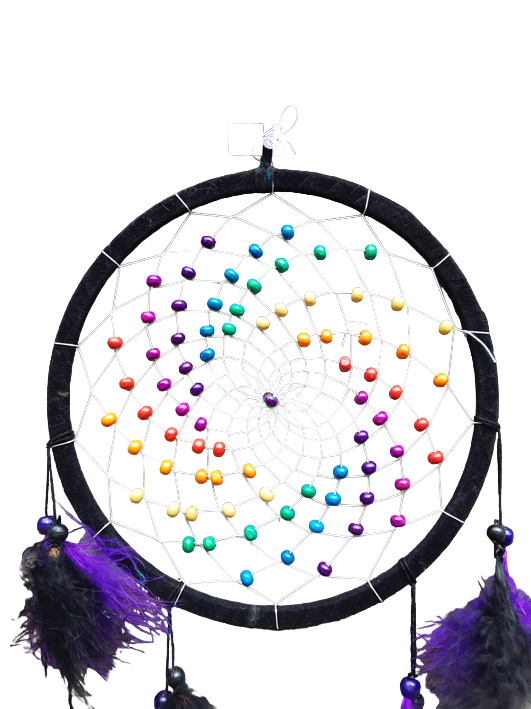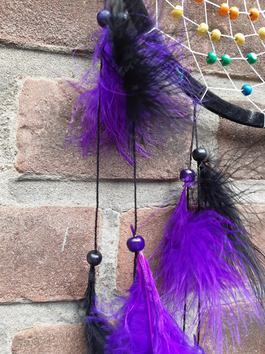 Artikelnummer: DE1810043 - p OverzichtEen mooie handgemaakte dromenvanger van 20 cm met mooie regenboog gekleurde houten kralen. De rand is zwart en de veren zwart en paars.