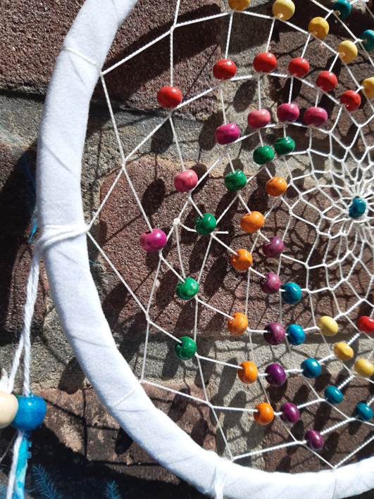 Artikelnummer: DE1810044 - p OverzichtEen prachtige dromenvanger in wit. Met mooie regenboogkleur houten kralen. De veren zijn aquablauw met wit.