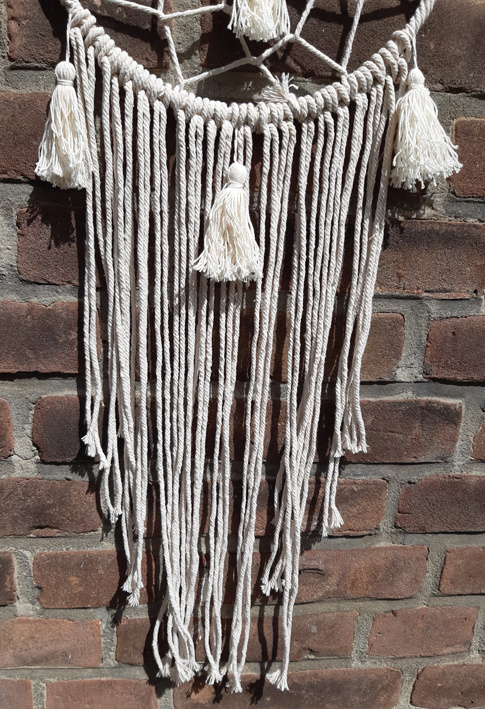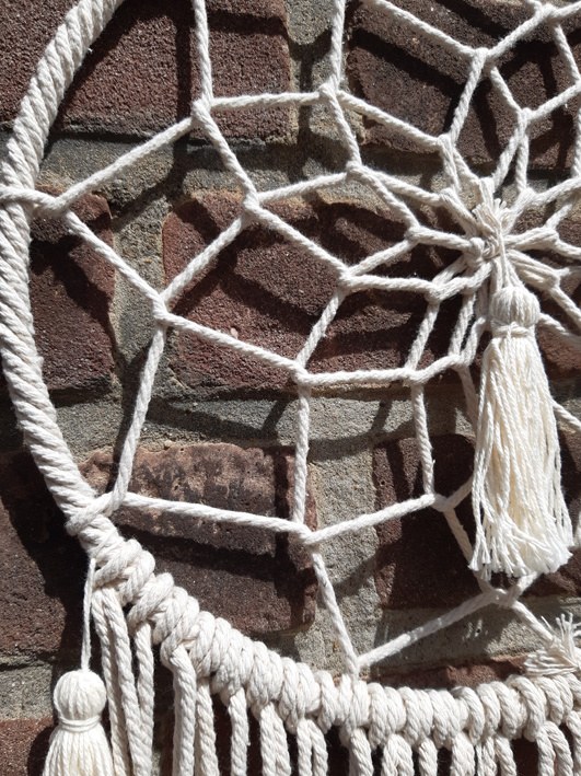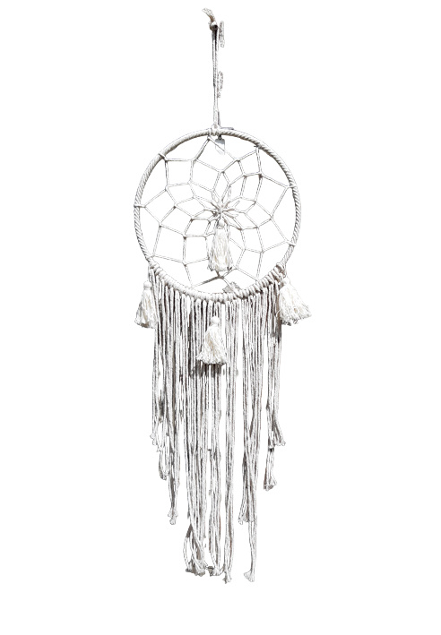 Artikelnummer: DE1810040 OverzichtEen mooie handgemaakt dromenvanger met een doorsnede van 26 cm. Aan de dromenvanger hangen kwastjes die het een leuk speels effect geven.