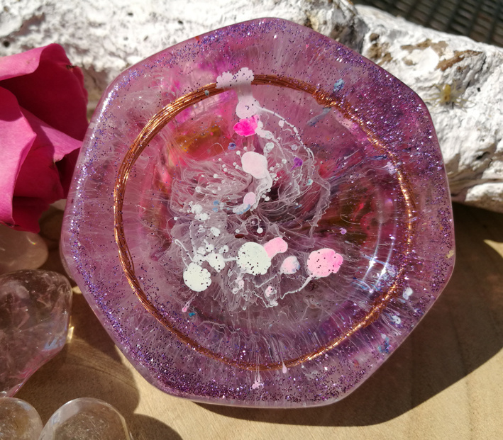 Artikelnummer: p OverzichtEen prachtige oplaadschijf met een koperen ring, mooie glitters en een prachtig patroon aan de bovenzijde en onderzijde.