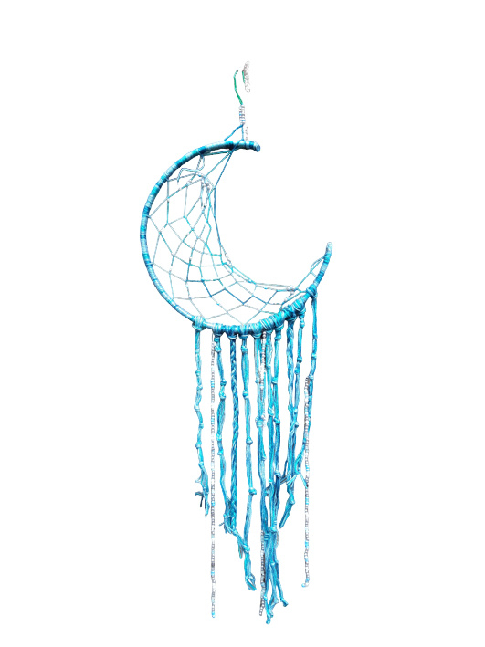 OverzichtEen prachtig handgemaakte dromenvanger in de vorm van een maan. Met mooie kralen in de dromenvanger en verschillend geknoopte draden aan de onderkant.