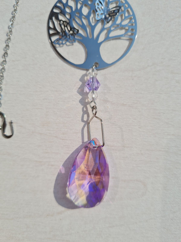 Artikelnummer: P0183 - p OverzichtEen superleuke raamhanger met een levensboom met hierop twee kleine vlindertjes. Eronder hangt een mooie violet kleurige hanger en kraaltjes.