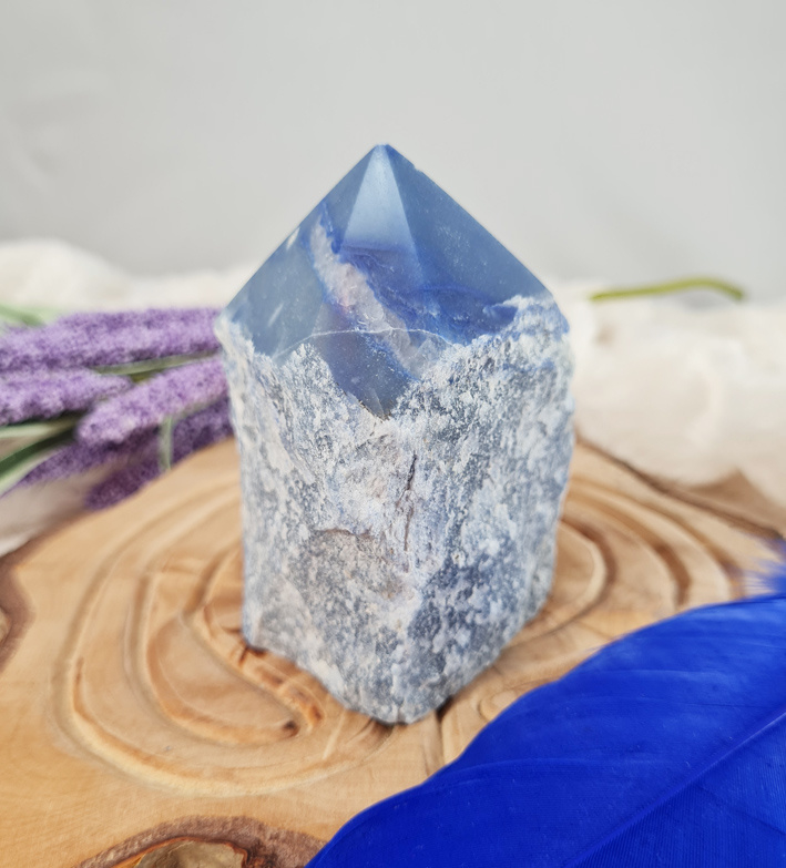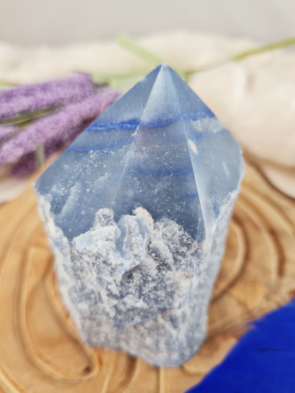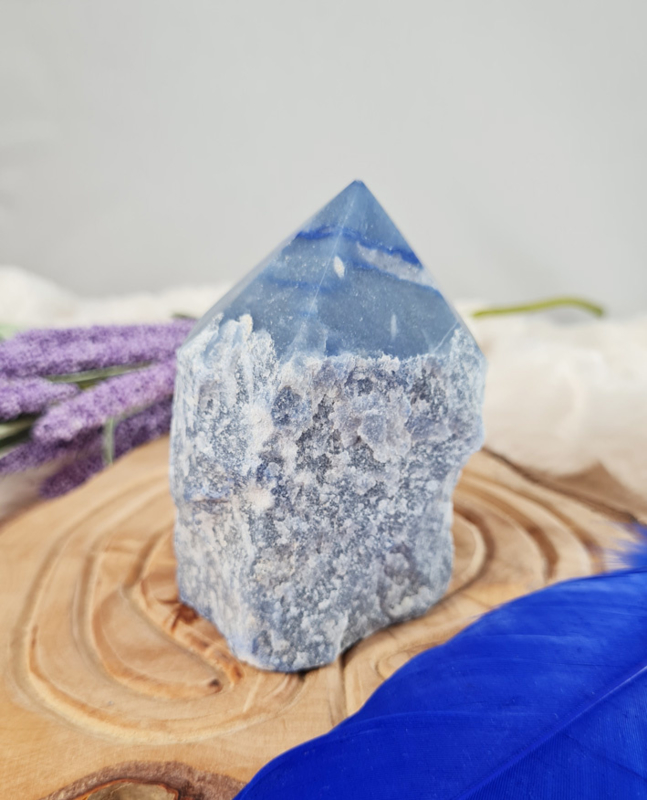 Een mooie Sodaliet punt met een bijgeslepen punt. Met een mooie rand van kwarts