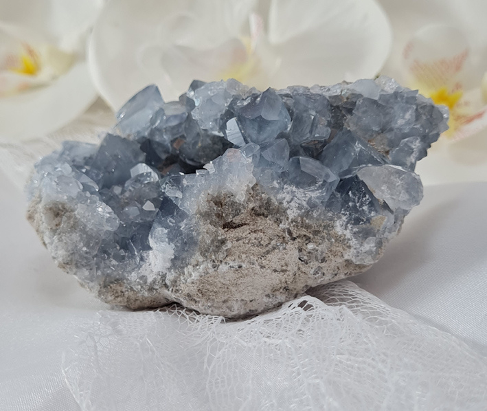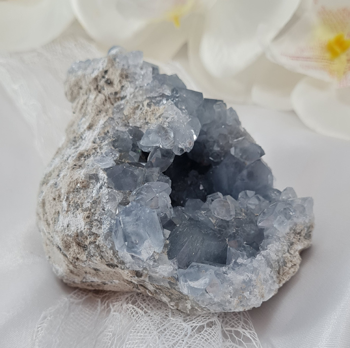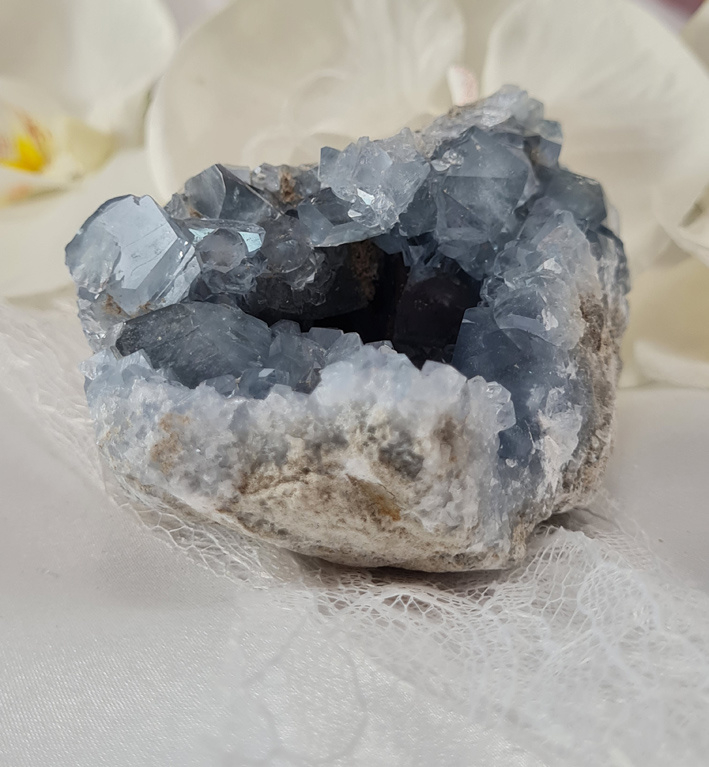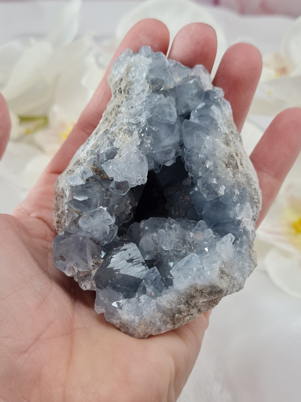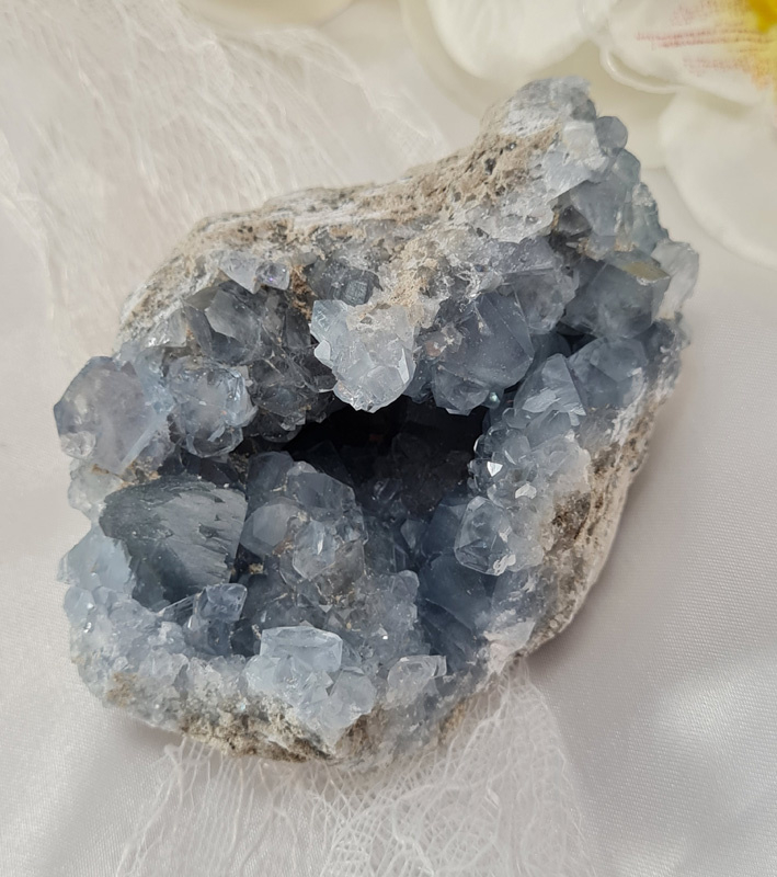 Omdat Celestien vrij broos kan zijn, kan het zijn dat er soms hele kleine kristallen los laten. Dit is niet te voorkomen. Behalve hier voorzichtig mee om te gaan.