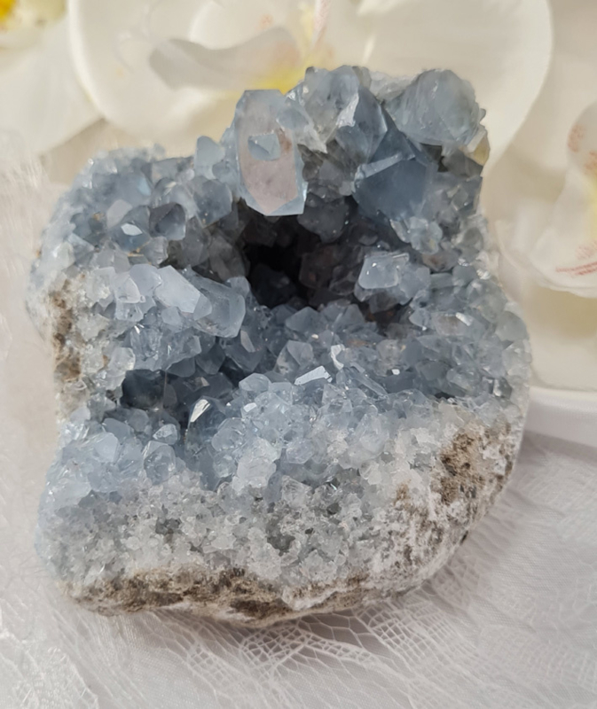 Omdat Celestien vrij broos kan zijn, kan het zijn dat er soms hele kleine kristallen los laten. Dit is niet te voorkomen. Behalve hier voorzichtig mee om te gaan.
