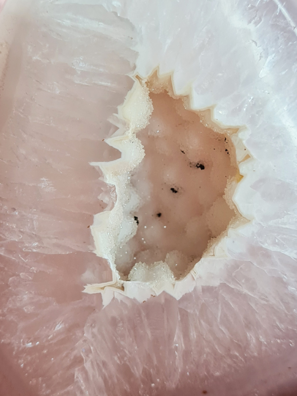 Ervaar de kalmerende en beschermende energie van deze prachtige Agaat sculptuur, een uniek natuurkunstwerk in zachte grijstinten, omgeven door een brede kwartsrand die het licht prachtig vangt. In het hart van deze agaat geode vlam schittert een fonkelende druzy edelsteen pocket, met kleine bolletjes en speelse zwarte stipjes – een subtiele, natuurlijke toets die deze vlam karakter geeft.