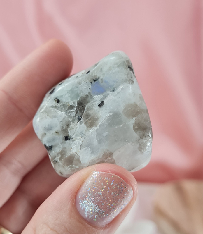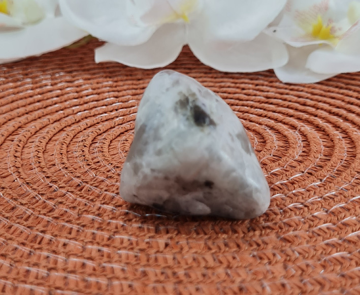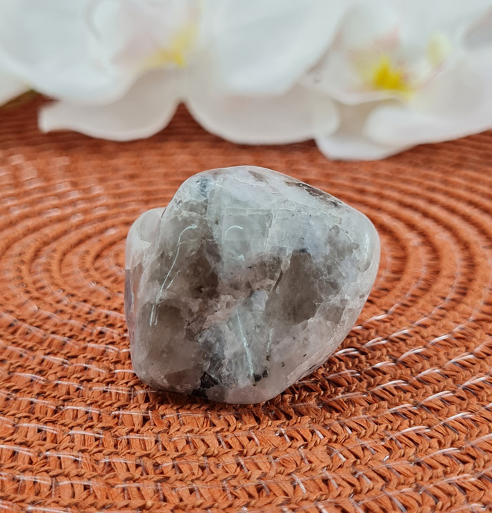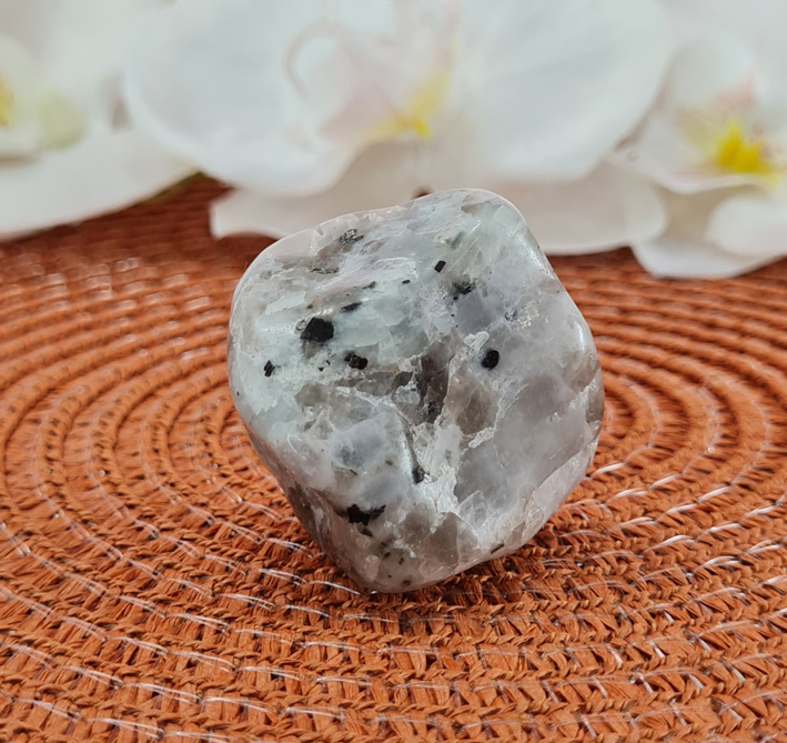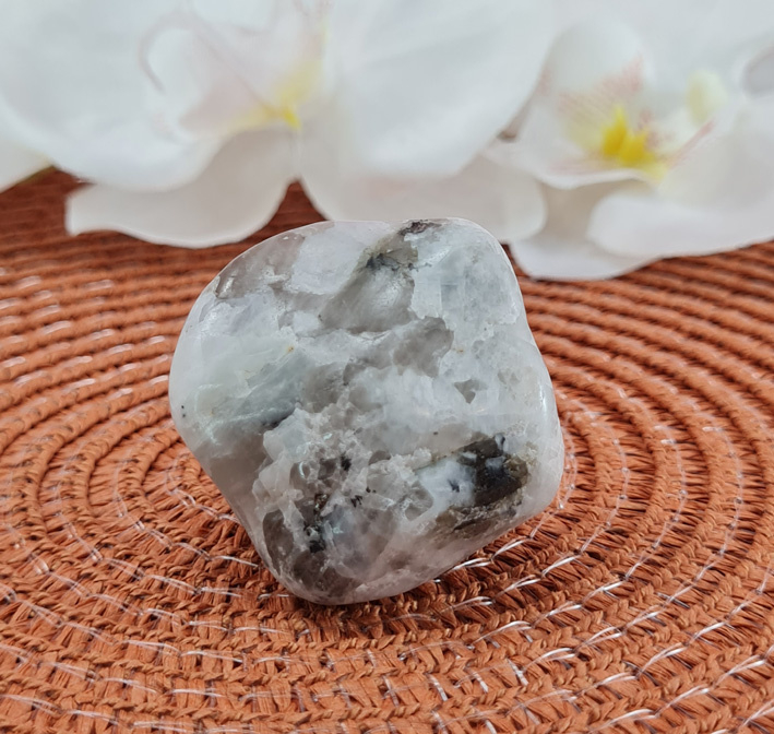Deze witte maansteen is wit van kleur, wat grijs en zwarte plekjes. Hier en daar een klein blauwe flash. Een mooi groot stuk om fijn in je handen te houden. Dit is een getrommeld exemplaar.