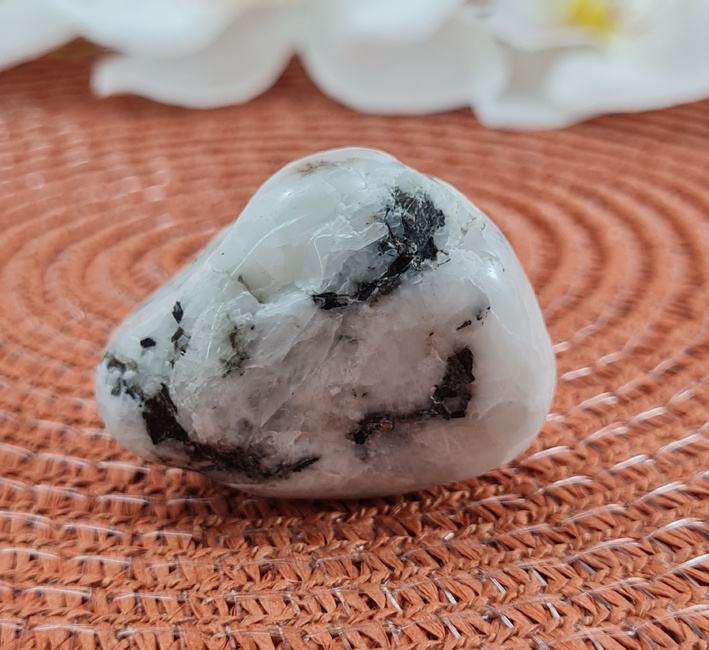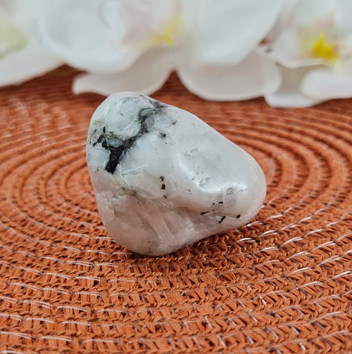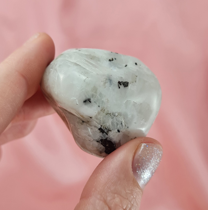 Deze witte maansteen is wit van kleur en heeft wat zwart en ook wat grijs. Een mooi groot stuk om fijn in je handen te houden. Dit is een getrommeld exemplaar.