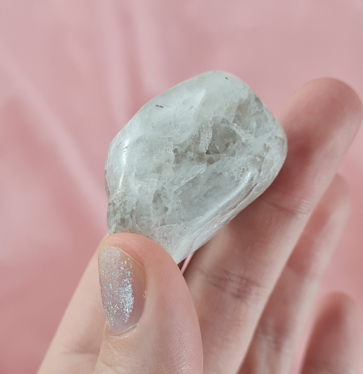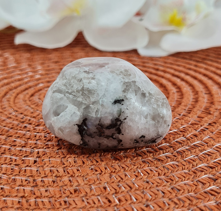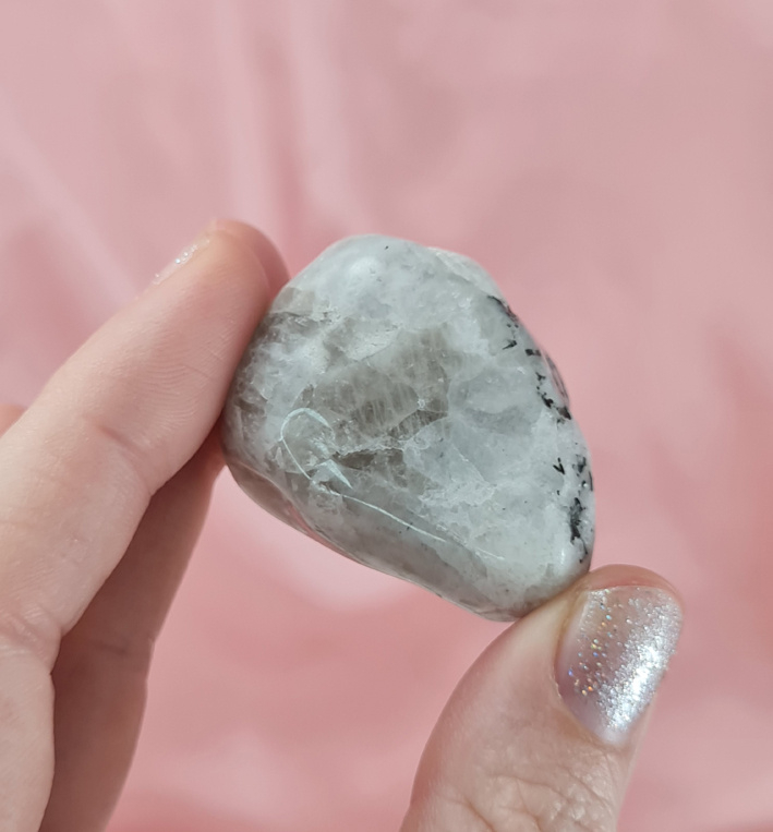 Deze witte maansteen is wit van kleur en heeft wat zwart en ook wat grijs. Een mooi stuk om fijn in je handen te houden. Dit is een getrommeld exemplaar.
