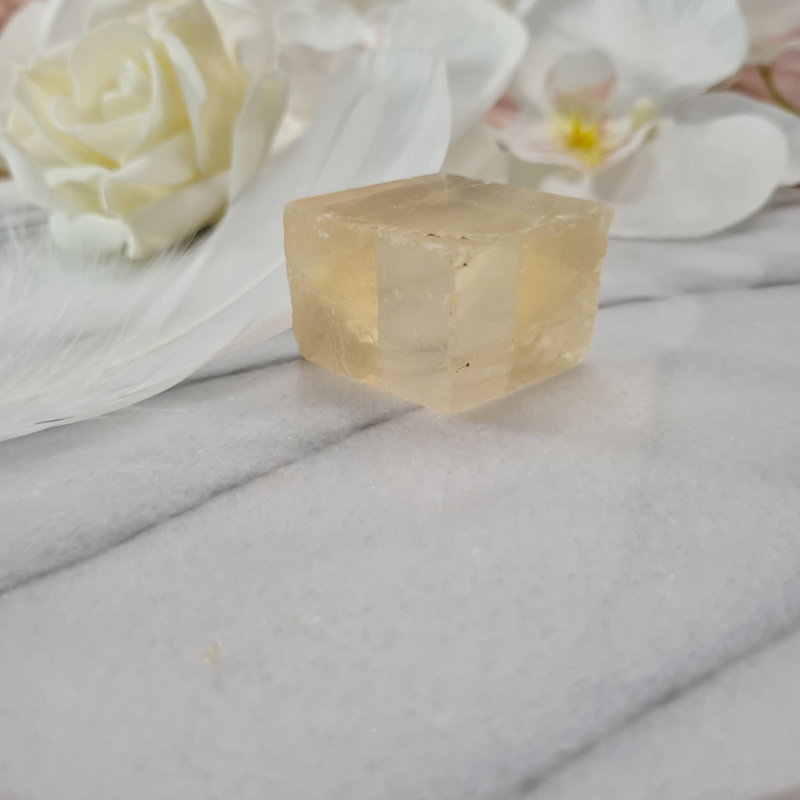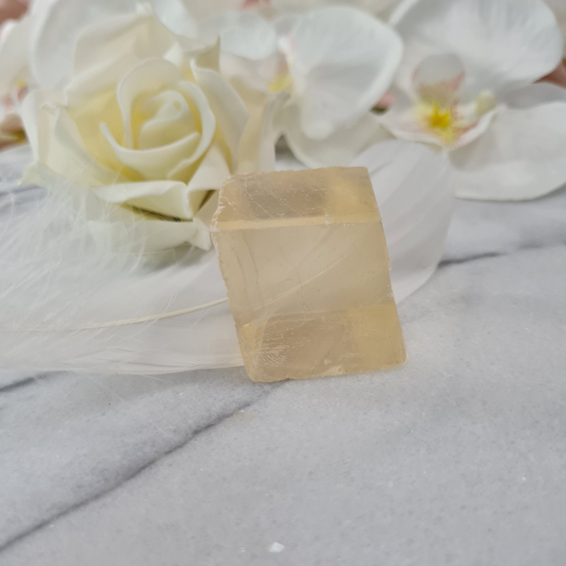 Deze mooie honingcalciet wordt ook wel dubbelspaat of optisch calciet genoemd. Met een mooie licht tot honing gele kleur.