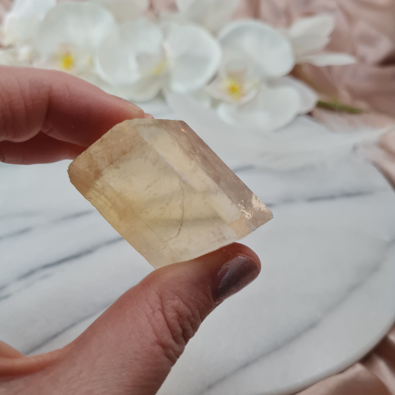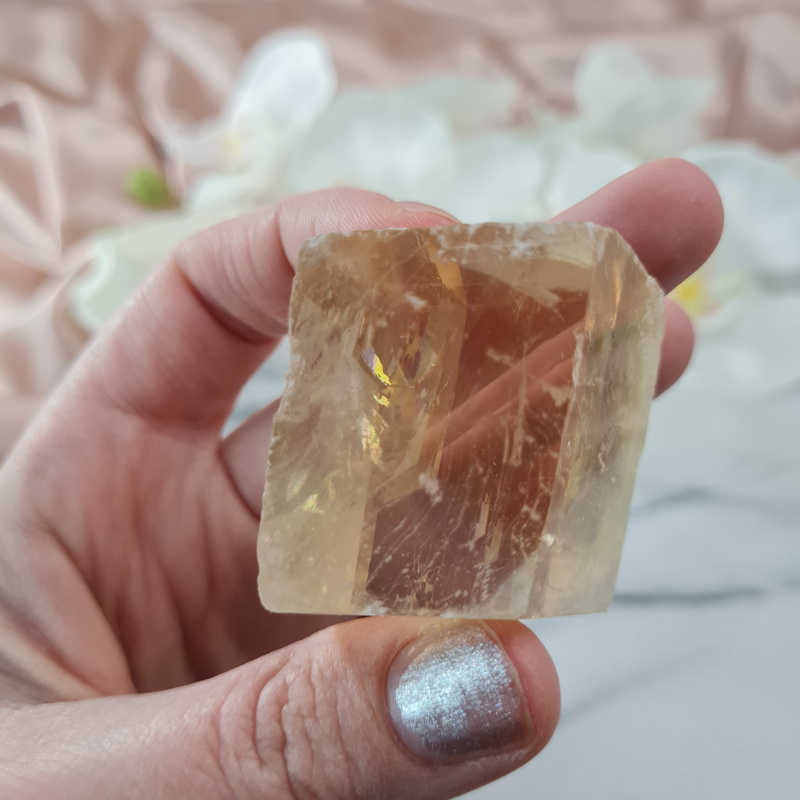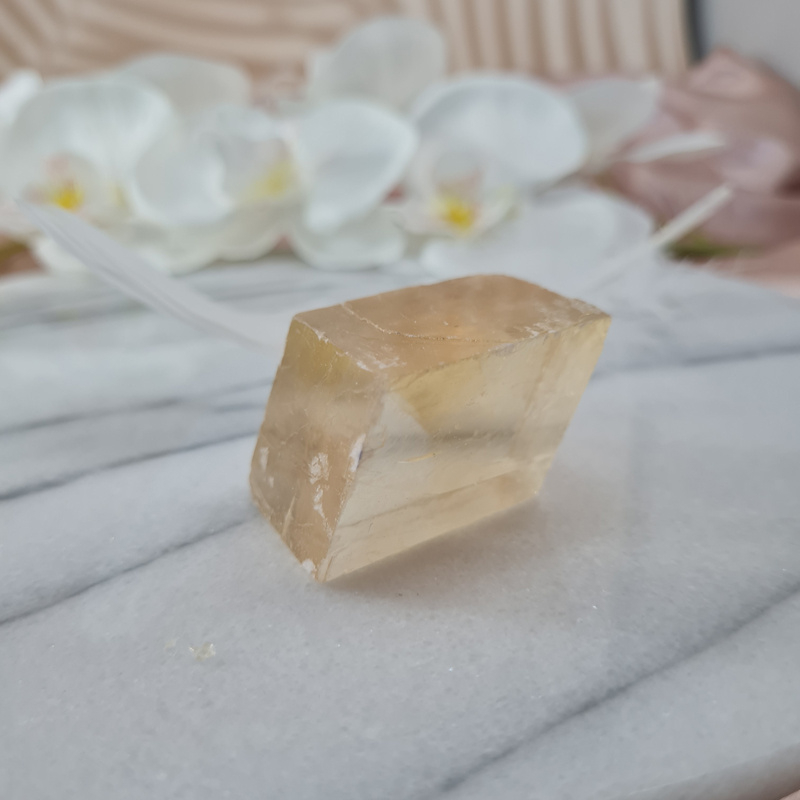 Deze mooie honingcalciet wordt ook wel dubbelspaat of optisch calciet genoemd. Met een mooie licht tot honing gele kleur.