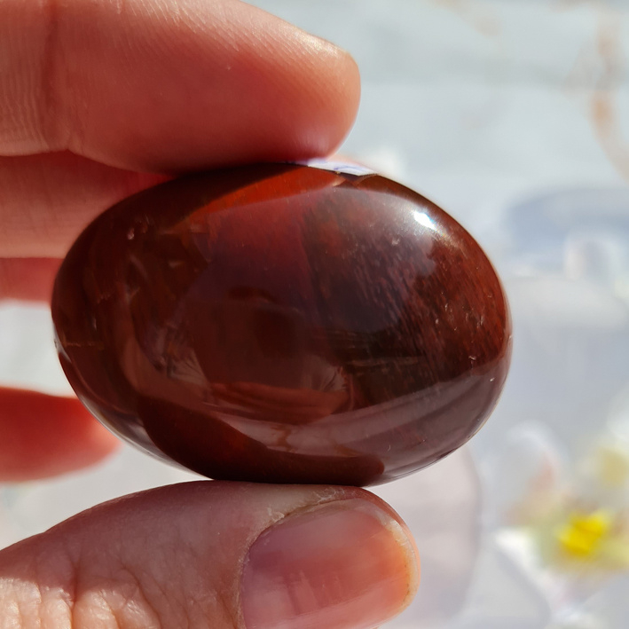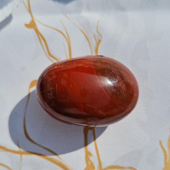 Deze mooie palmsteen is mooi glad gepolijst. Hij is vrij ovaal van vorm.