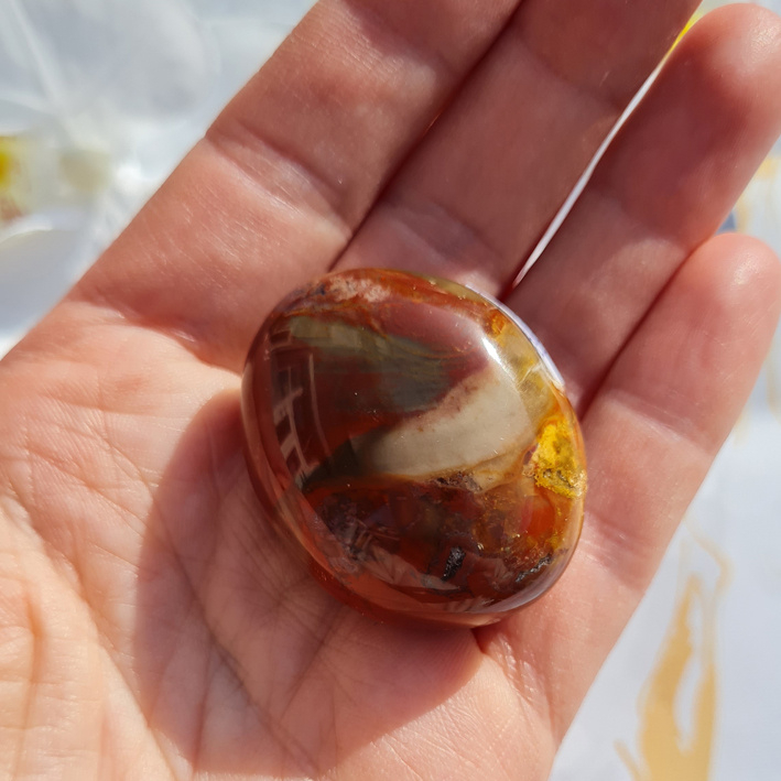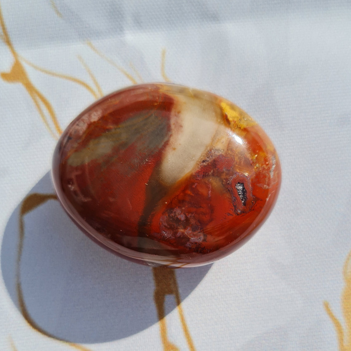 Een mooi vrij ovale steen met twee vrij platte kanten. Zeer glad gepolijst. Een prachtig patroon is zichtbaar op deze steen.